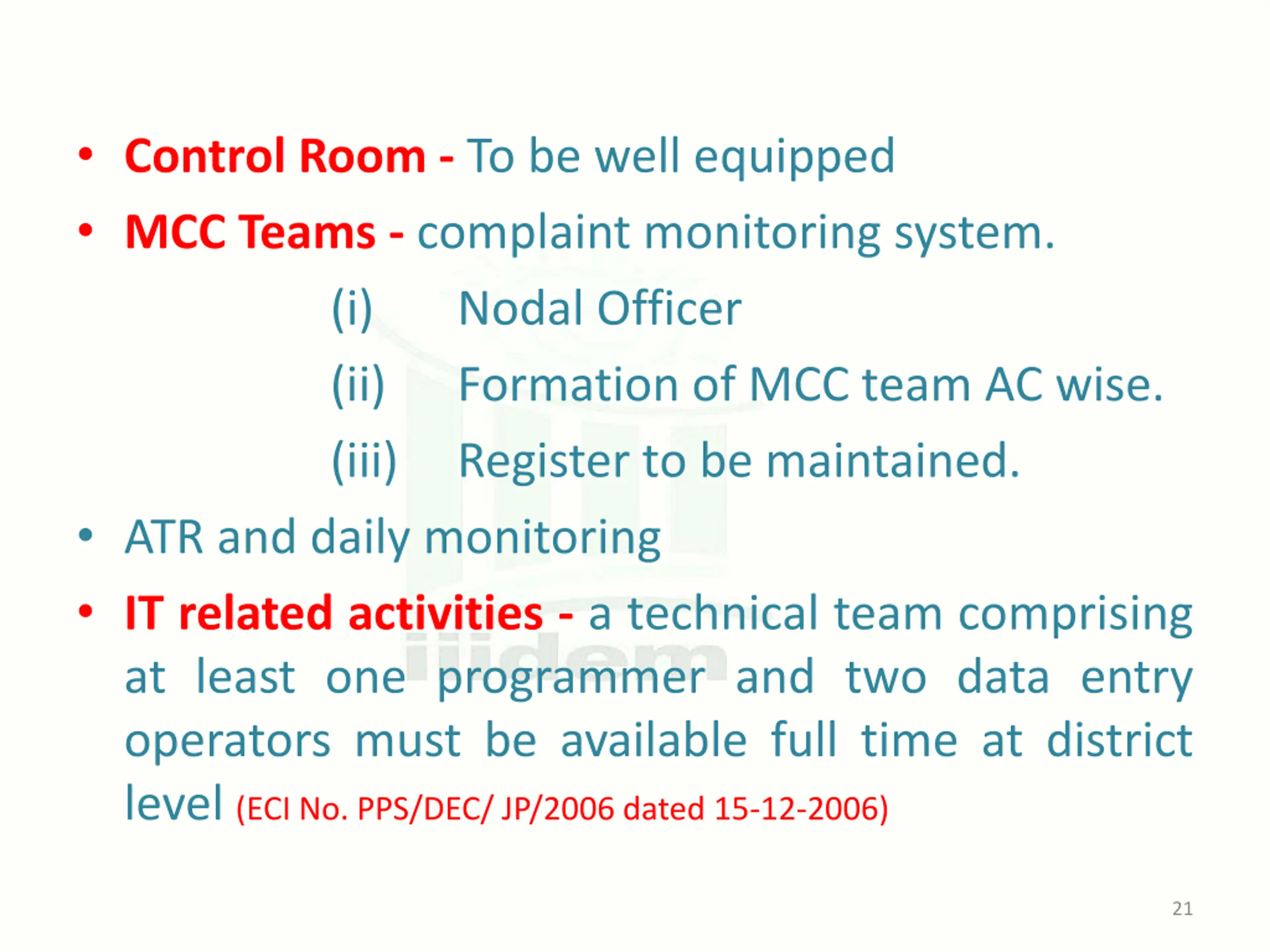 Control Room - To be well equipped MCC Teams - complaint monitoring system. (i) Nodal Officer (ii) Formation of MCC team AC wise. (iii) Register to be maintained. ATR and daily monitoring IT related activities - a technical team comprising at least one programmer and two data entry operators must be available full time at district level (ECI No. PPS/DEC/ JP/2006 dated 15-12-2006) 21