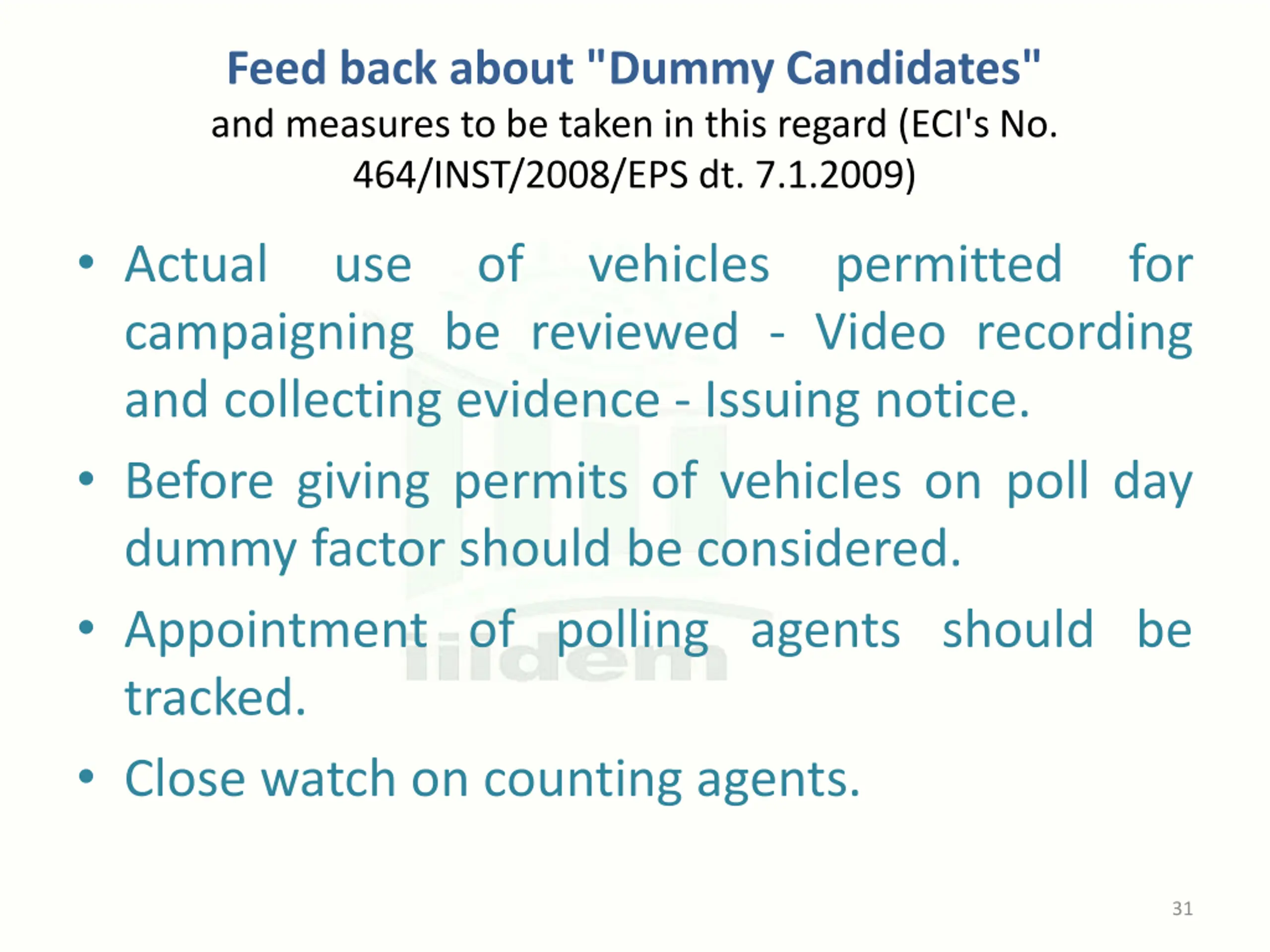 Feed back about "Dummy Candidates" and measures to be taken in this regard (ECI's No. 464/INST/2008/EPS dt. 7.1.2009) Actual campaigning be reviewed - Video recording and collecting evidence - Issuing notice. Before giving permits of vehicles on poll day dummy factor should be considered. Appointment of polling agents should be tracked. Close watch on counting agents. use of vehicles permitted for 31