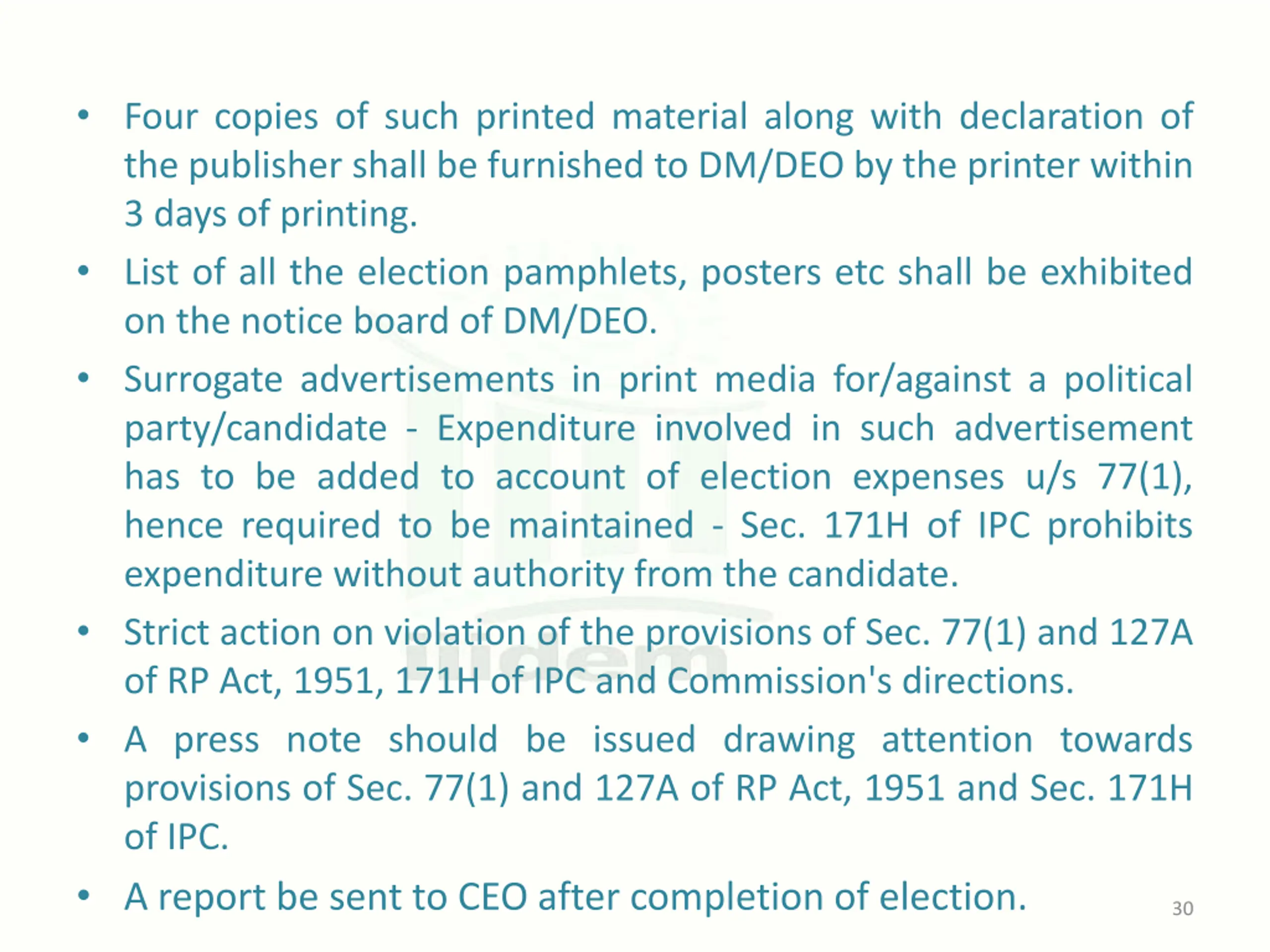 Four copies of such printed material along with declaration of the publisher shall be furnished to DM/DEO by the printer within 3 days of printing. List of all the election pamphlets, posters etc shall be exhibited on the notice board of DM/DEO. Surrogate advertisements in print media for/against a political party/candidate - Expenditure involved in such advertisement has to be added to account of election expenses u/s 77(1), hence required to be maintained - Sec. 171H of IPC prohibits expenditure without authority from the candidate. Strict action on violation of the provisions of Sec. 77(1) and 127A of RP Act, 1951, 171H of IPC and Commission's directions. A press note should be issued drawing attention towards provisions of Sec. 77(1) and 127A of RP Act, 1951 and Sec. 171H of IPC. A report be sent to CEO after completion of election. 30