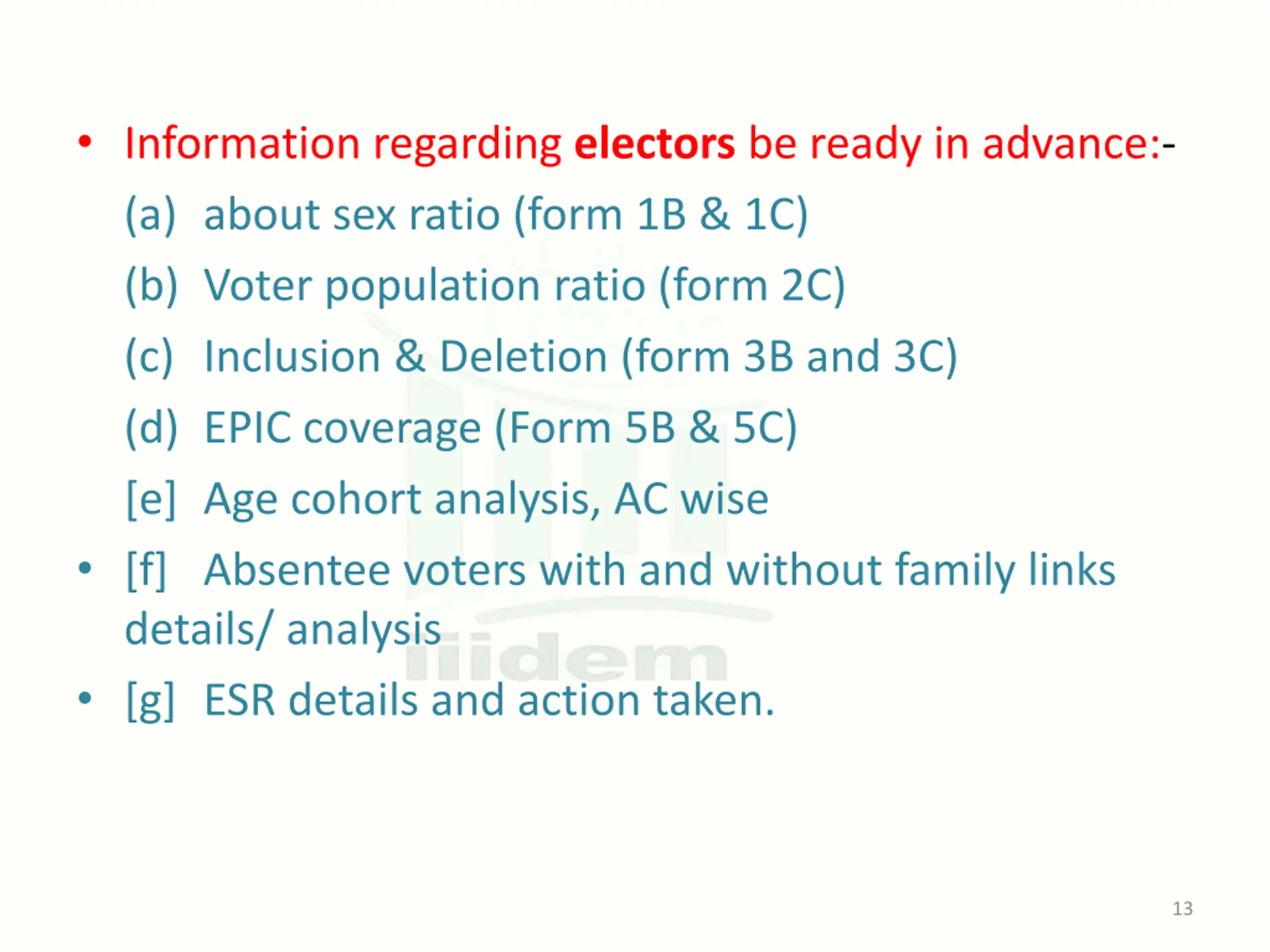 Information regarding electors be ready in advance:- (a) about sex ratio (form 1B & 1C) (b) Voter population ratio (form 2C) (c) Inclusion & Deletion (form 3B and 3C) (d) EPIC coverage (Form 5B & 5C) [e] Age cohort analysis, AC wise [f] Absentee voters with and without family links details/ analysis [g] ESR details and action taken. 13