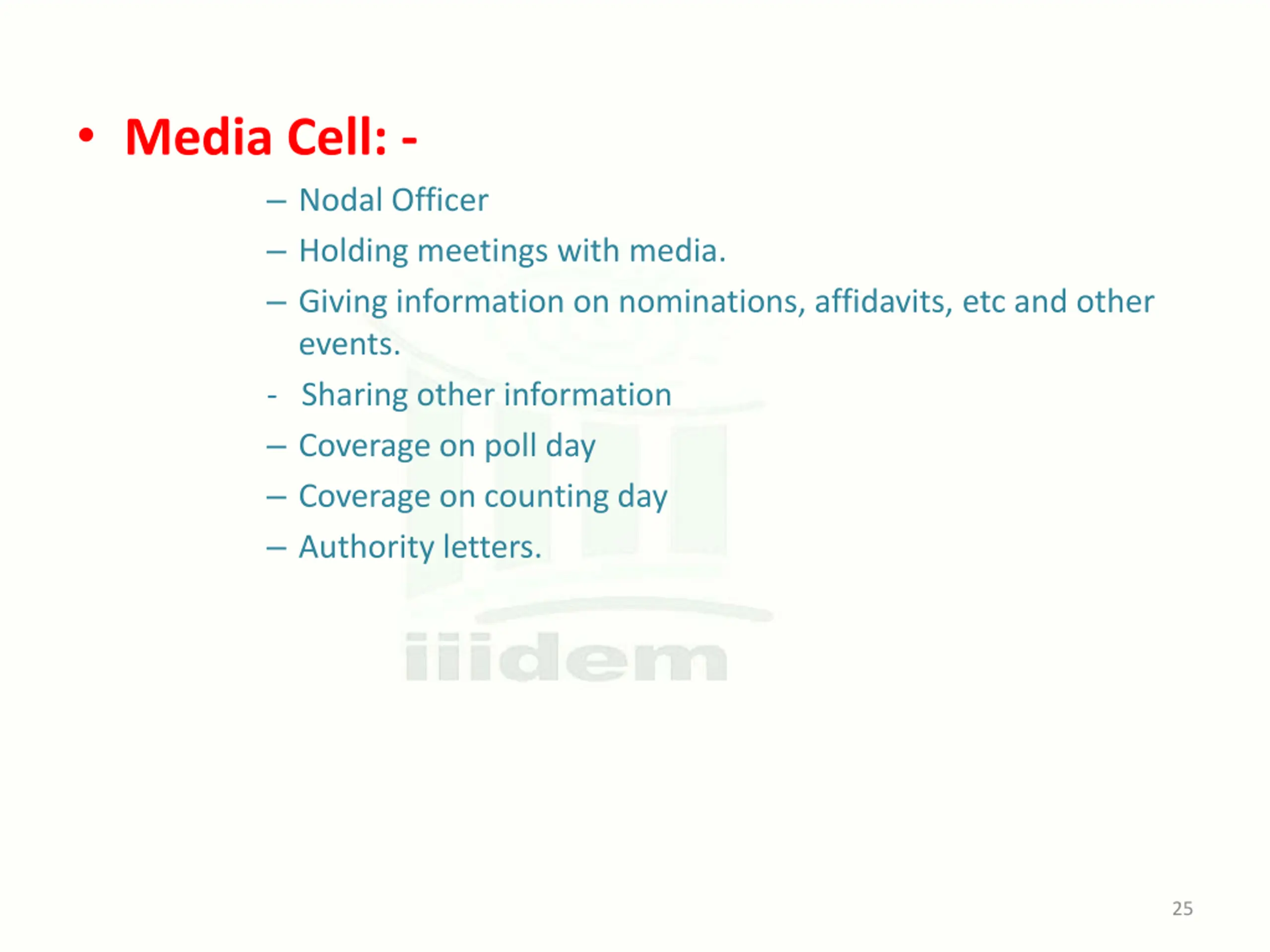 Media Cell: - Nodal Officer Holding meetings with media. Giving information on nominations, affidavits, etc and other events. - Sharing other information Coverage on poll day Coverage on counting day Authority letters. 25