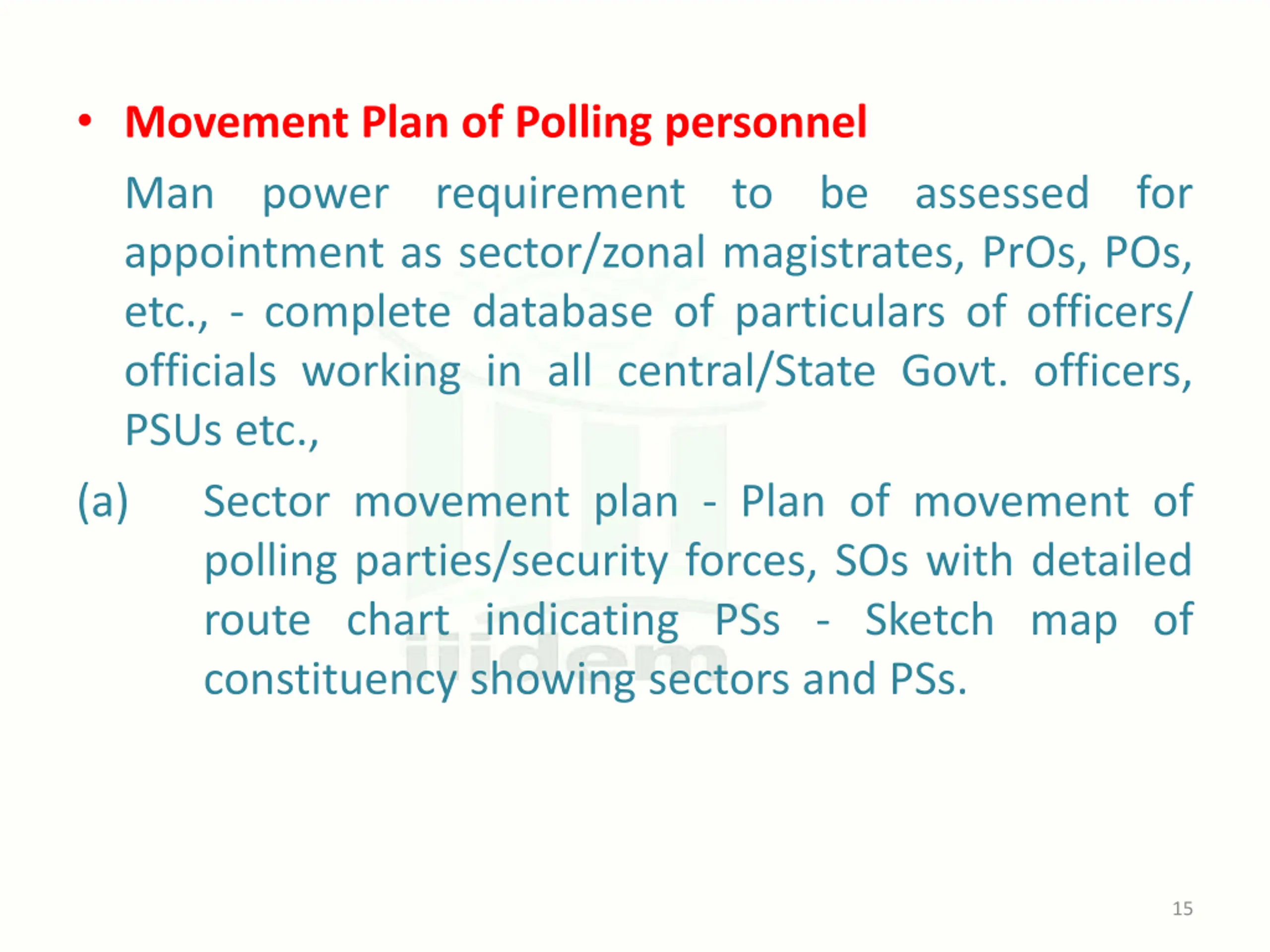 Movement Plan of Polling personnel Man power requirement to be assessed for appointment as sector/zonal magistrates, PrOs, POs, etc., - complete database of particulars of officers/ officials working in all central/State Govt. officers, PSUs etc., (a) Sector movement plan - Plan of movement of polling parties/security forces, SOs with detailed route chart indicating PSs - Sketch map of constituency showing sectors and PSs. 15
