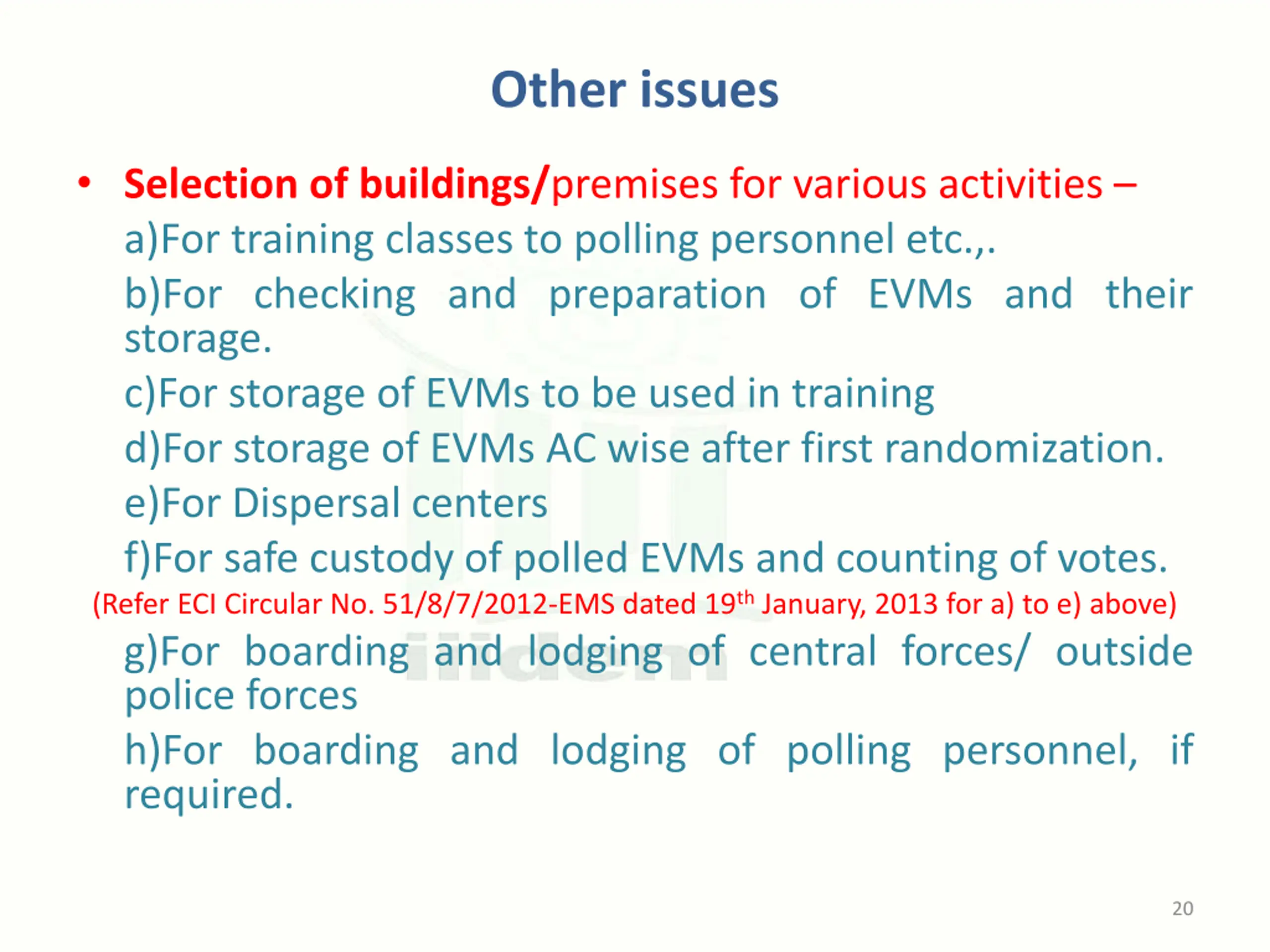 Other issues Selection of buildings/premises for various activities a)For training classes to polling personnel etc.,. b)For checking and preparation of EVMs and their storage. c)For storage of EVMs to be used in training d)For storage of EVMs AC wise after first randomization. e)For Dispersal centers f)For safe custody of polled EVMs and counting of votes. (Refer ECI Circular No. 51/8/7/2012-EMS dated 19th January, 2013 for a) to e) above) g)For boarding and lodging of central forces/ outside police forces h)For boarding and lodging of polling personnel, if required. 20