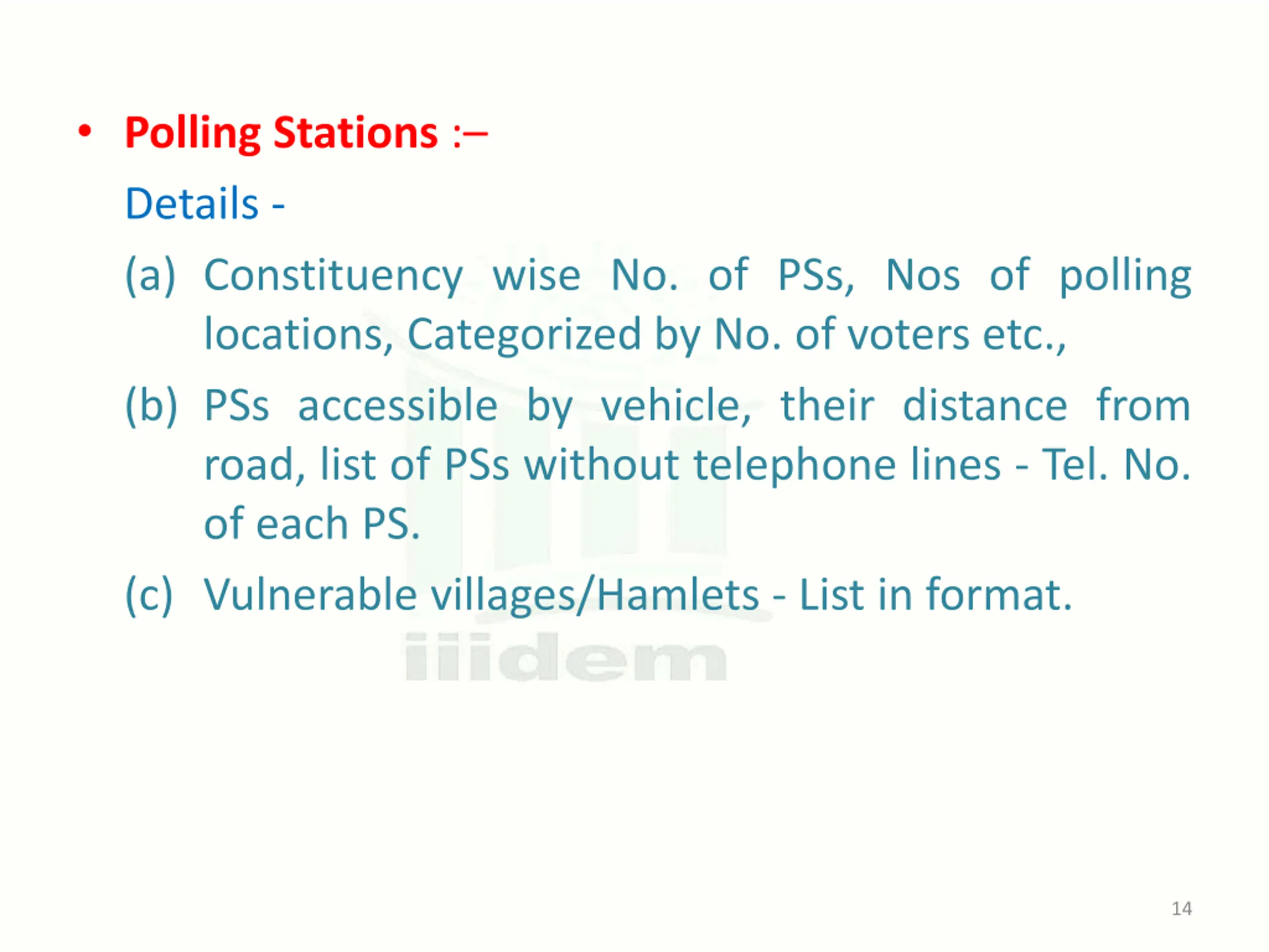Polling Stations : Details - (a) Constituency wise No. of PSs, Nos of polling locations, Categorized by No. of voters etc., (b) PSs accessible by vehicle, their distance from road, list of PSs without telephone lines - Tel. No. of each PS. (c) Vulnerable villages/Hamlets - List in format. 14