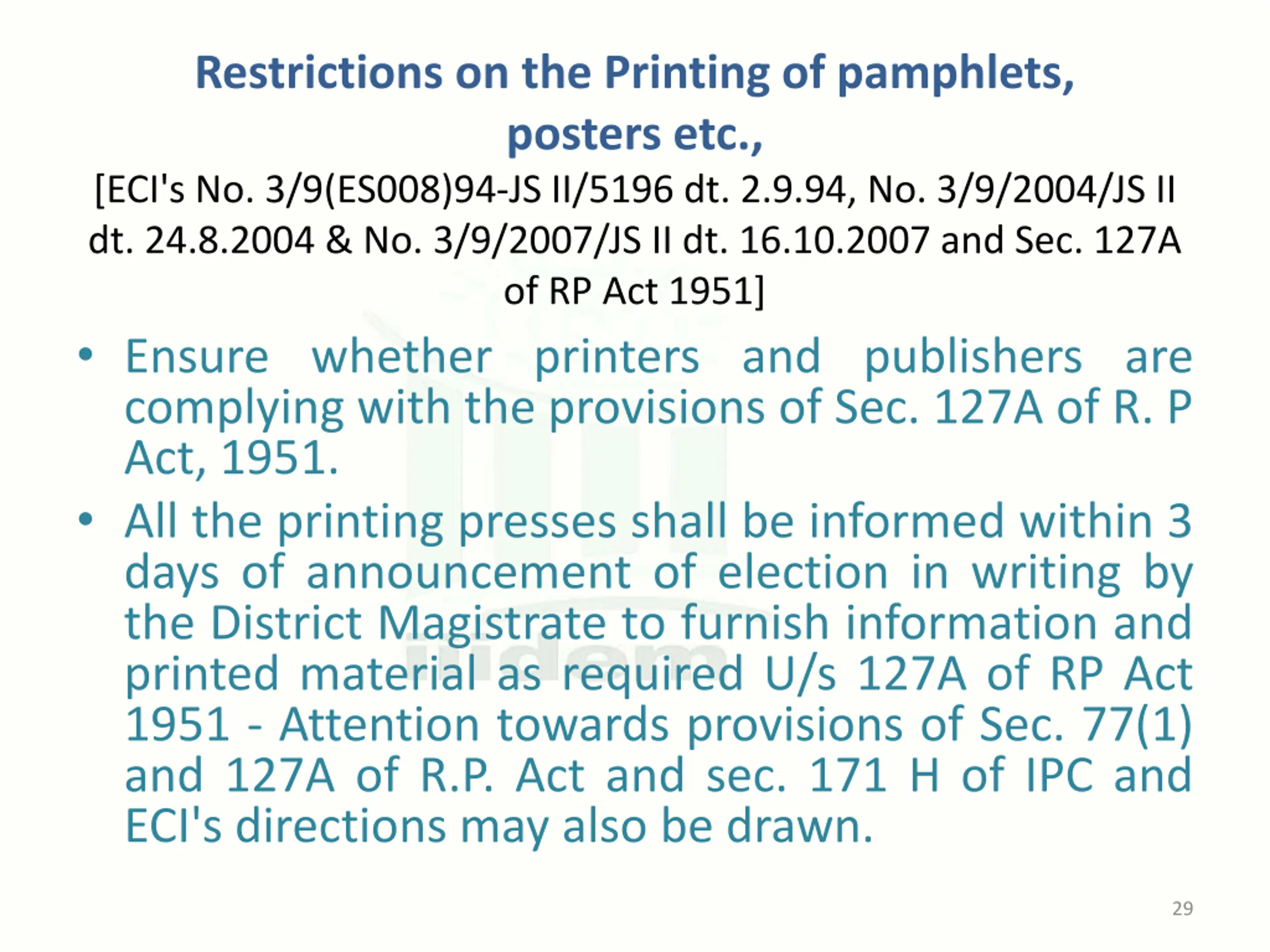 Restrictions on the Printing of pamphlets, posters etc., [ECI's No. 3/9(ES008)94-JS II/5196 dt. 2.9.94, No. 3/9/2004/JS II dt. 24.8.2004 & No. 3/9/2007/JS II dt. 16.10.2007 and Sec. 127A of RP Act 1951] Ensure whether printers and publishers are complying with the provisions of Sec. 127A of R. P Act, 1951. All the printing presses shall be informed within 3 days of announcement of election in writing by the District Magistrate to furnish information and printed material as required U/s 127A of RP Act 1951 - Attention towards provisions of Sec. 77(1) and 127A of R.P. Act and sec. 171 H of IPC and ECI's directions may also be drawn. 29