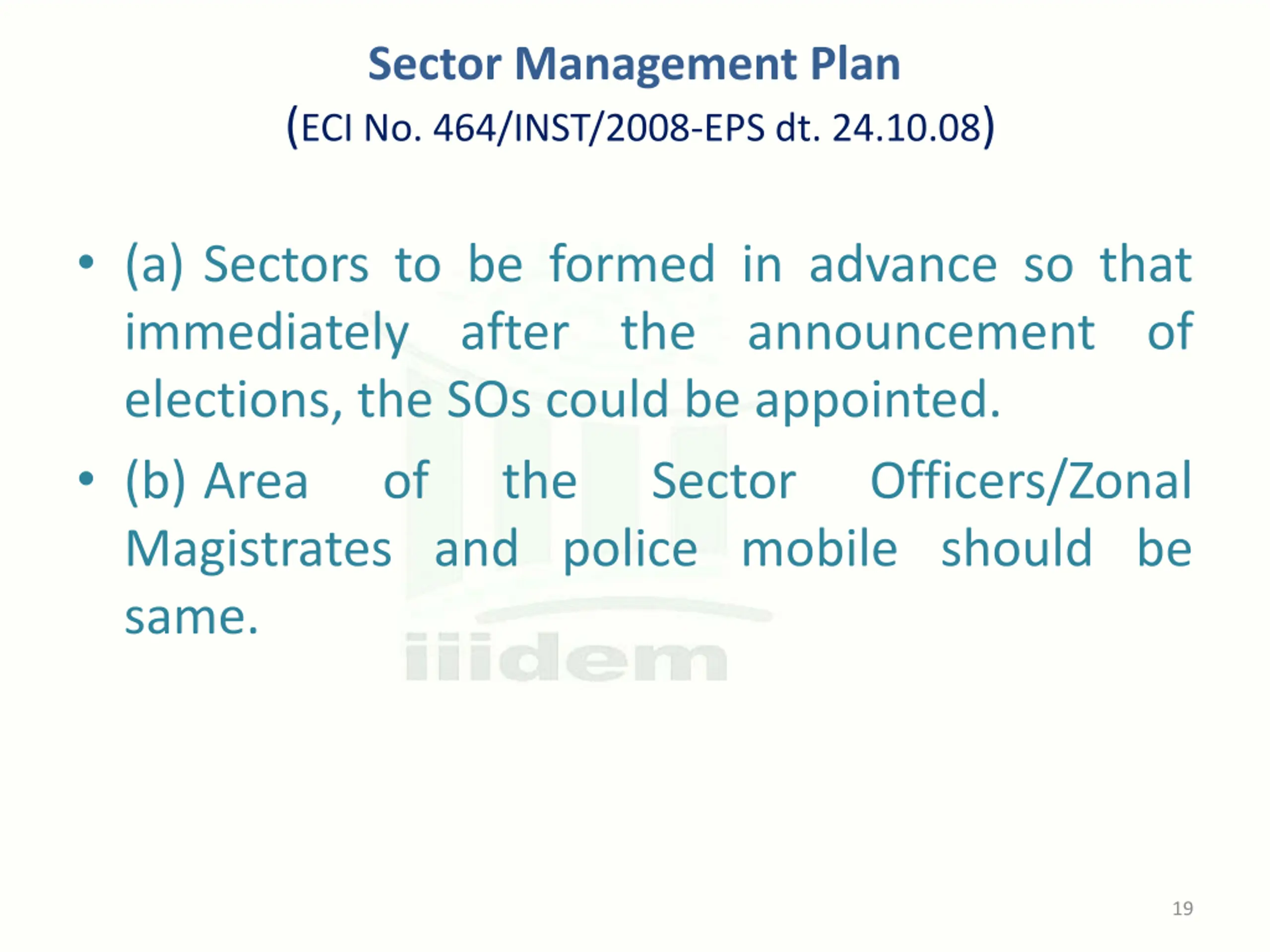 Sector Management Plan (ECI No. 464/INST/2008-EPS dt. 24.10.08) (a) Sectors to be formed in advance so that immediately after the announcement of elections, the SOs could be appointed. (b) Area of the Magistrates and police mobile should be same. Sector Officers/Zonal 19