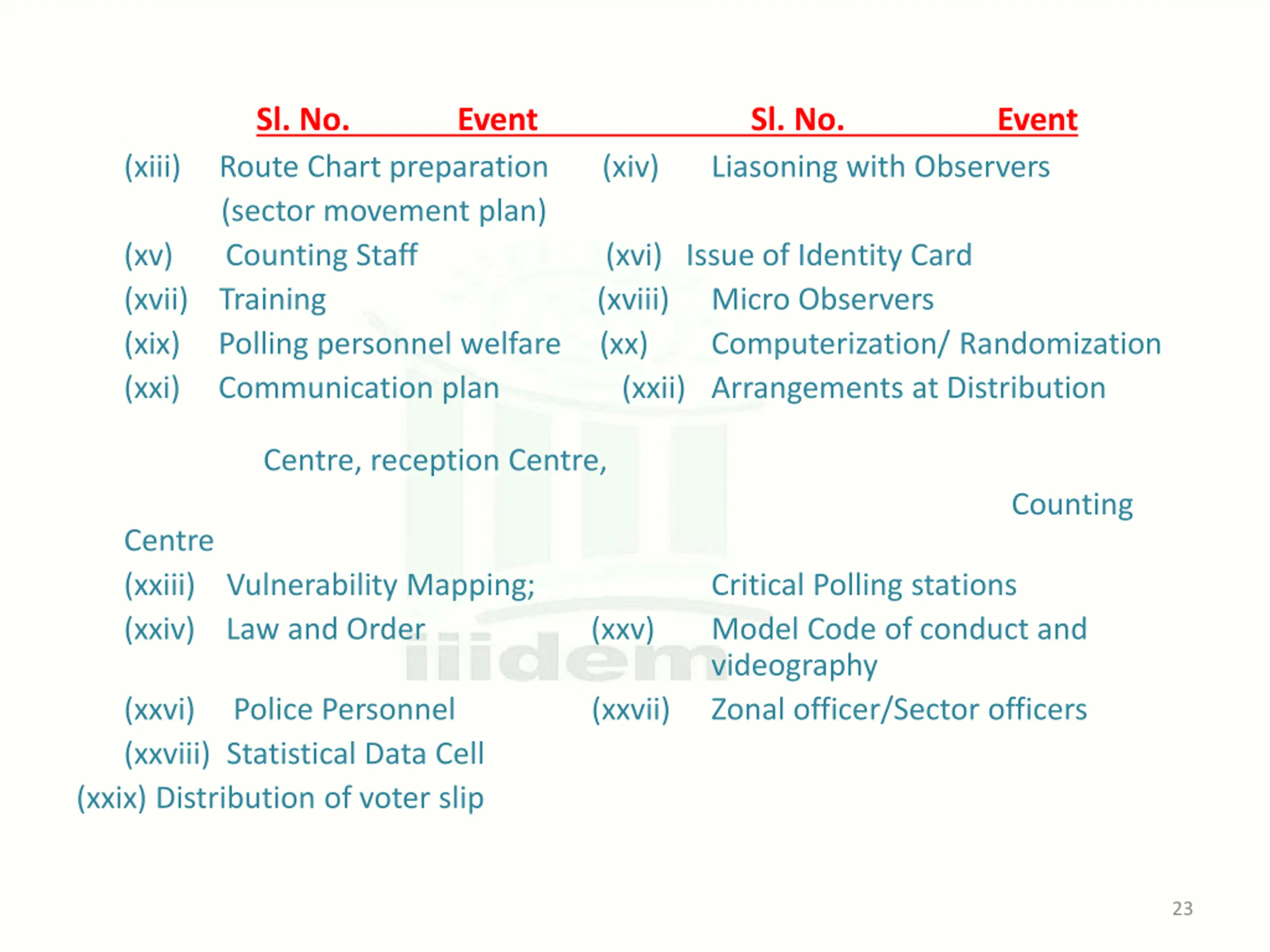 Sl. No. Event Sl. No. Liasoning with Observers Event . (xiii) Route Chart preparation (xiv) (sector movement plan) (xv) Counting Staff (xvi) Issue of Identity Card (xvii) Training (xviii) (xix) Polling personnel welfare (xx) (xxi) Communication plan Centre, reception Centre, Centre (xxiii) Vulnerability Mapping; (xxiv) Law and Order (xxv) (xxvi) Police Personnel (xxvii) (xxviii) Statistical Data Cell (xxix) Distribution of voter slip Micro Observers Computerization/ Randomization (xxii) Arrangements at Distribution Counting Critical Polling stations Model Code of conduct and videography Zonal officer/Sector officers 23