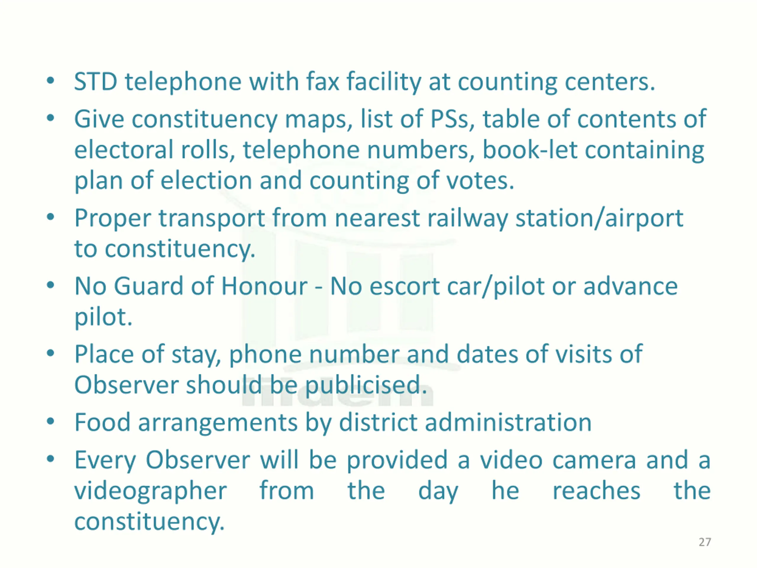 STD telephone with fax facility at counting centers. Give constituency maps, list of PSs, table of contents of electoral rolls, telephone numbers, book-let containing plan of election and counting of votes. Proper transport from nearest railway station/airport to constituency. No Guard of Honour - No escort car/pilot or advance pilot. Place of stay, phone number and dates of visits of Observer should be publicised. Food arrangements by district administration Every Observer will be provided a video camera and a videographer from the constituency. day he reaches the 27