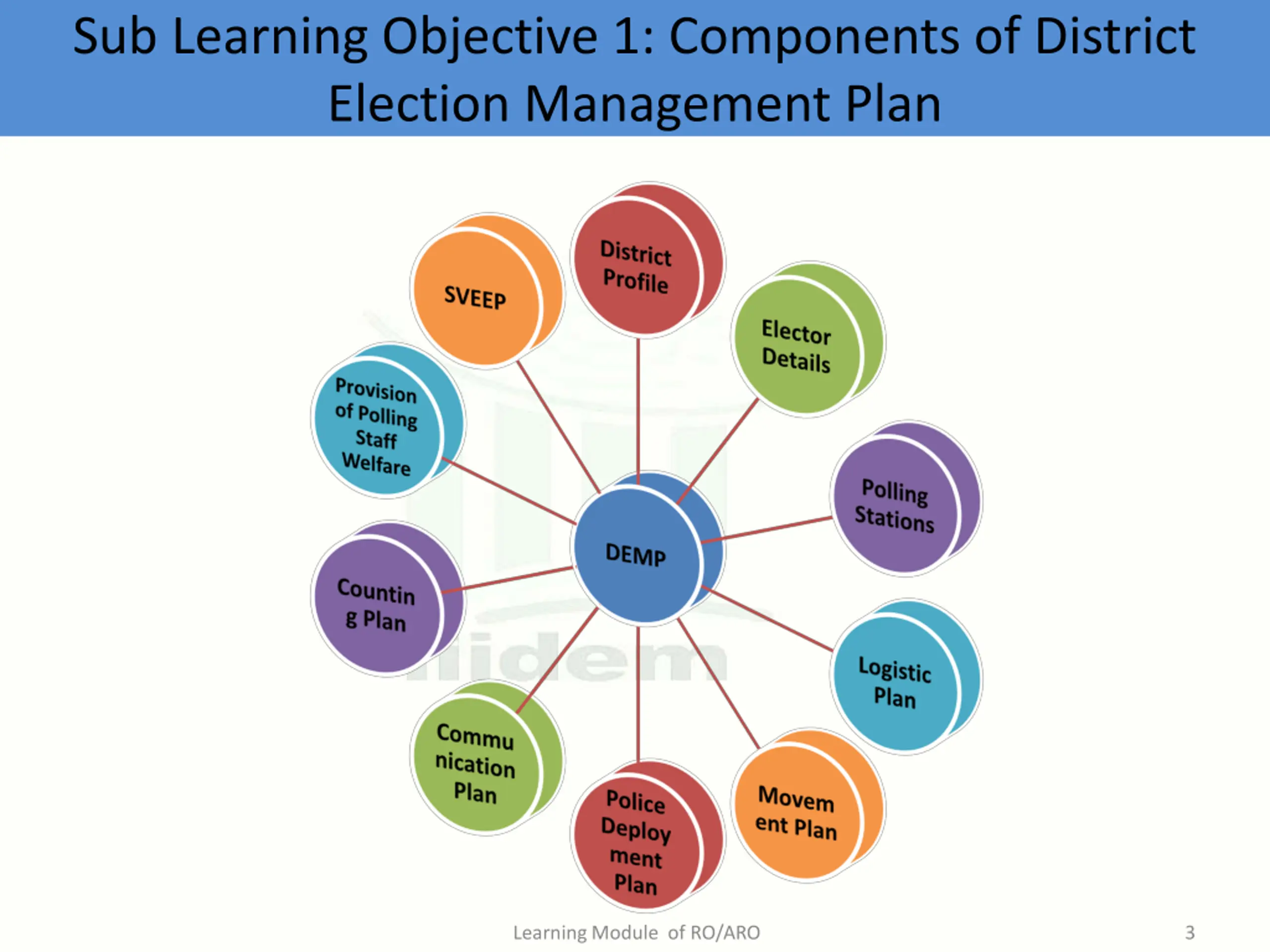 Learning Objective : To facilitate preparation of the District Election Management Plan (DEMP) 1 To list components of the DEMP 2 1 To list major requisite information To list components of the DEMP 3 To list steps of Process of Preparation Learning Module of RO/ARO 2
