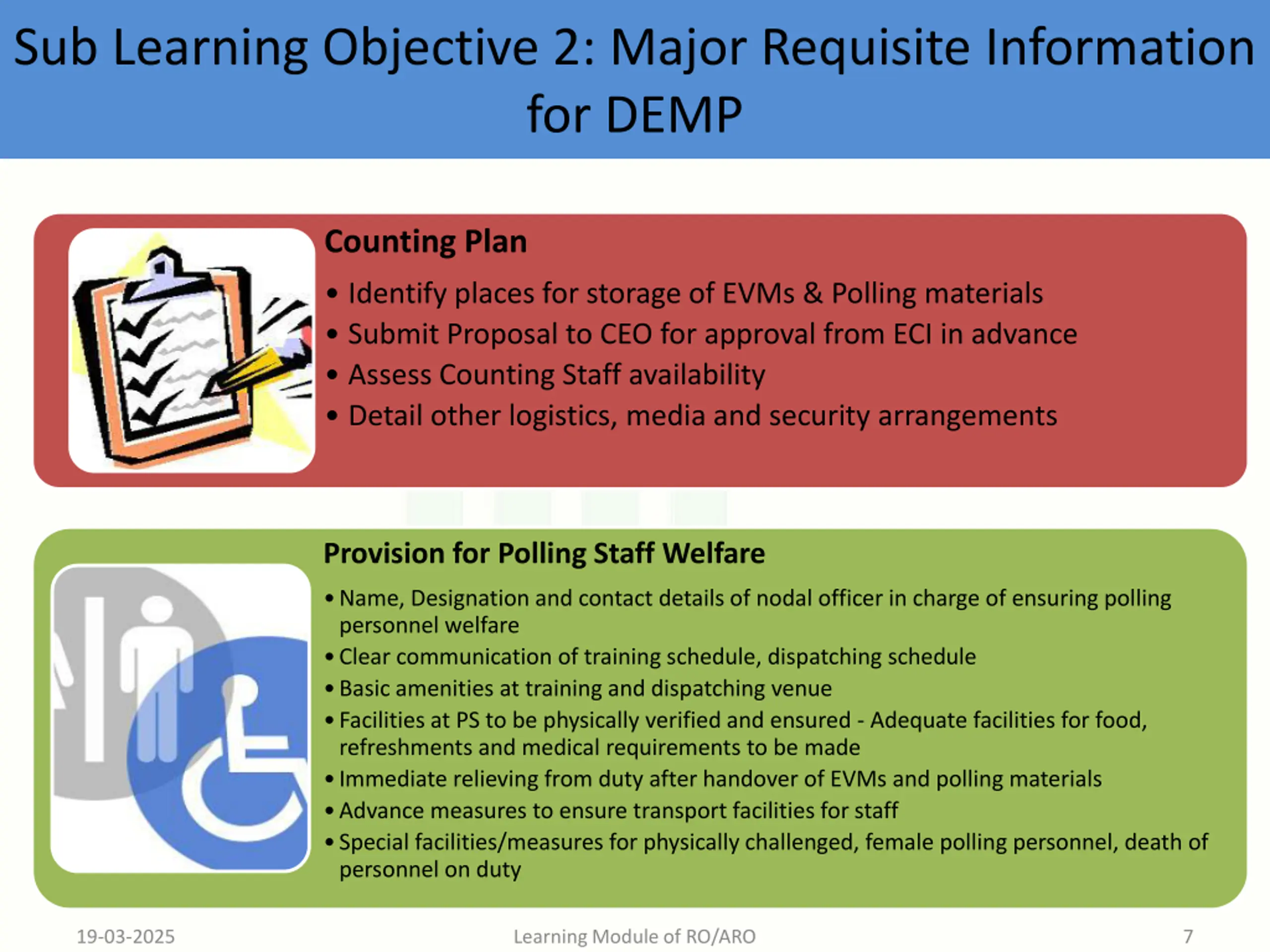 Sub Learning Objective 2: Major Requisite Information for DEMP Counting Plan Identify places for storage of EVMs & Polling materials Submit Proposal to CEO for approval from ECI in advance Assess Counting Staff availability Detail other logistics, media and security arrangements Provision for Polling Staff Welfare Name, Designation and contact details of nodal officer in charge of ensuring polling personnel welfare Clear communication of training schedule, dispatching schedule Basic amenities at training and dispatching venue Facilities at PS to be physically verified and ensured - Adequate facilities for food, refreshments and medical requirements to be made Immediate relieving from duty after handover of EVMs and polling materials Advance measures to ensure transport facilities for staff Special facilities/measures for physically challenged, female polling personnel, death of personnel on duty 19-03-2025 Learning Module of RO/ARO 7
