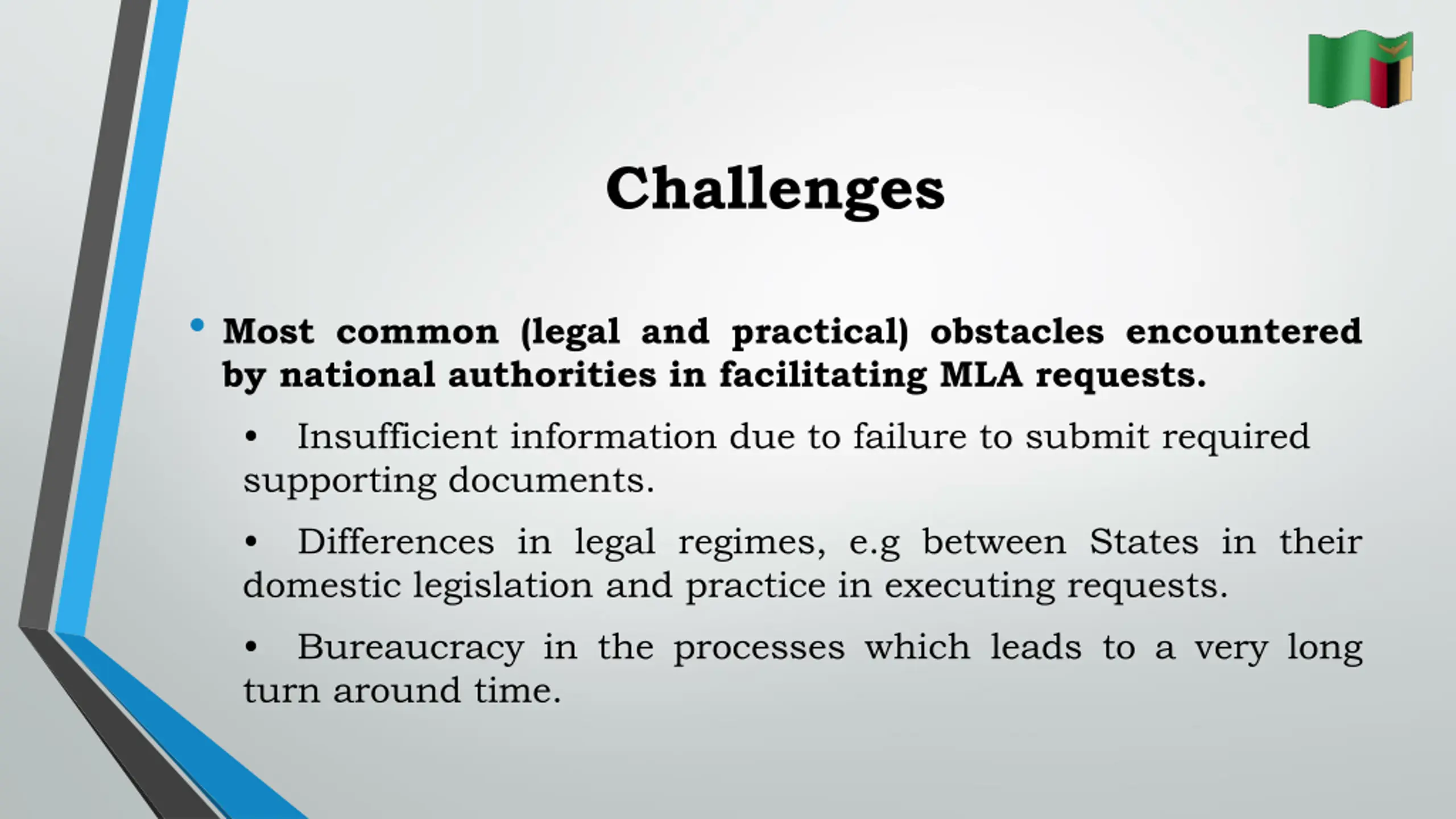 Challenges Most common (legal and practical) obstacles encountered by national authorities in facilitating MLA requests. supporting documents. Insufficient information due to failure to submit required domestic legislation and practice in executing requests. Differences in legal regimes, e.g between States in their turn around time. Bureaucracy in the processes which leads to a very long