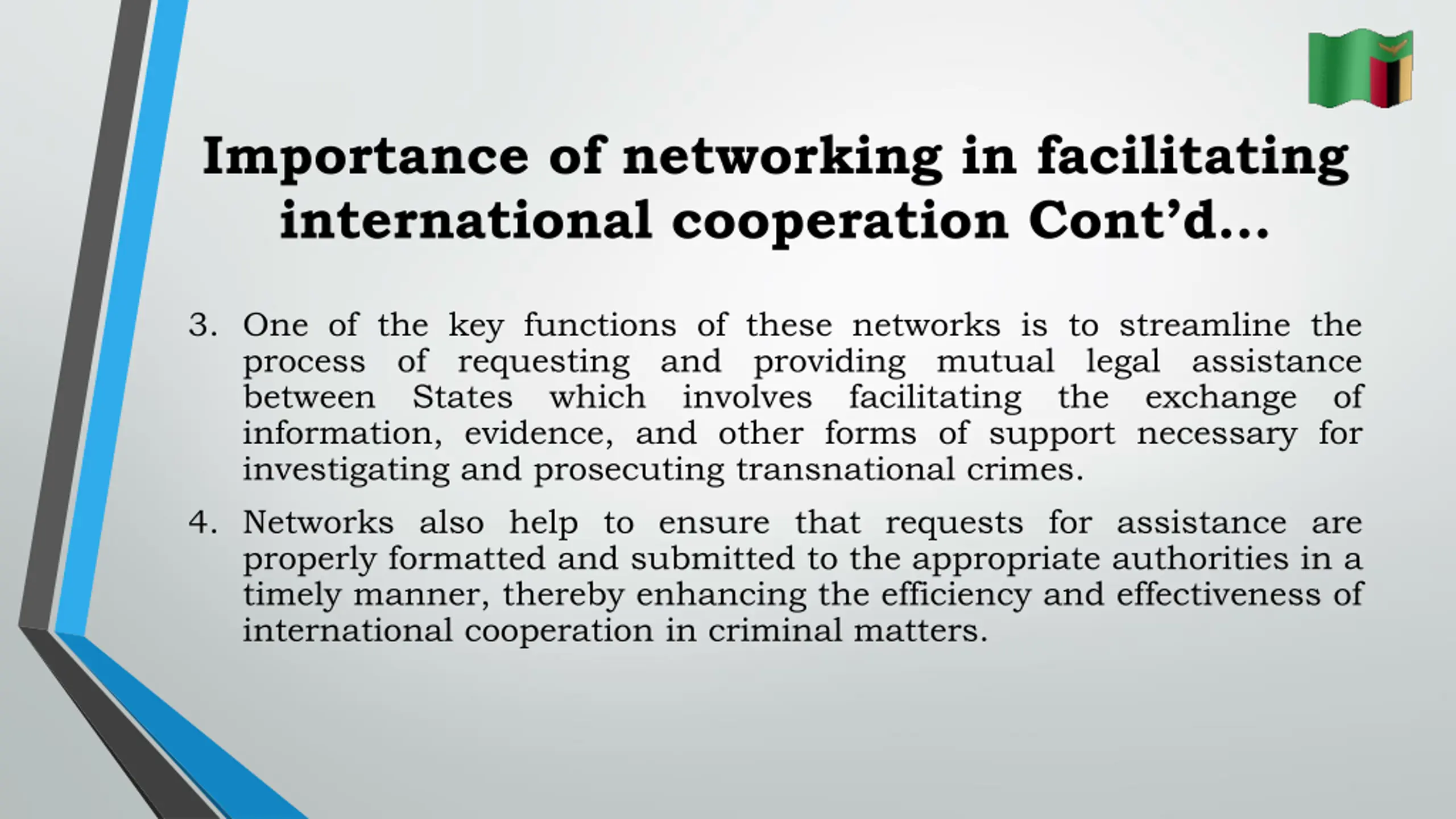 Importance of networking in facilitating international cooperation Cont d 3. One of the key functions of these networks is to streamline the process of requesting and providing between States which involves information, evidence, and other forms of support necessary for investigating and prosecuting transnational crimes. 4. Networks also help to ensure that requests for assistance are properly formatted and submitted to the appropriate authorities in a timely manner, thereby enhancing the efficiency and effectiveness of international cooperation in criminal matters. mutual legal the assistance exchange facilitating of