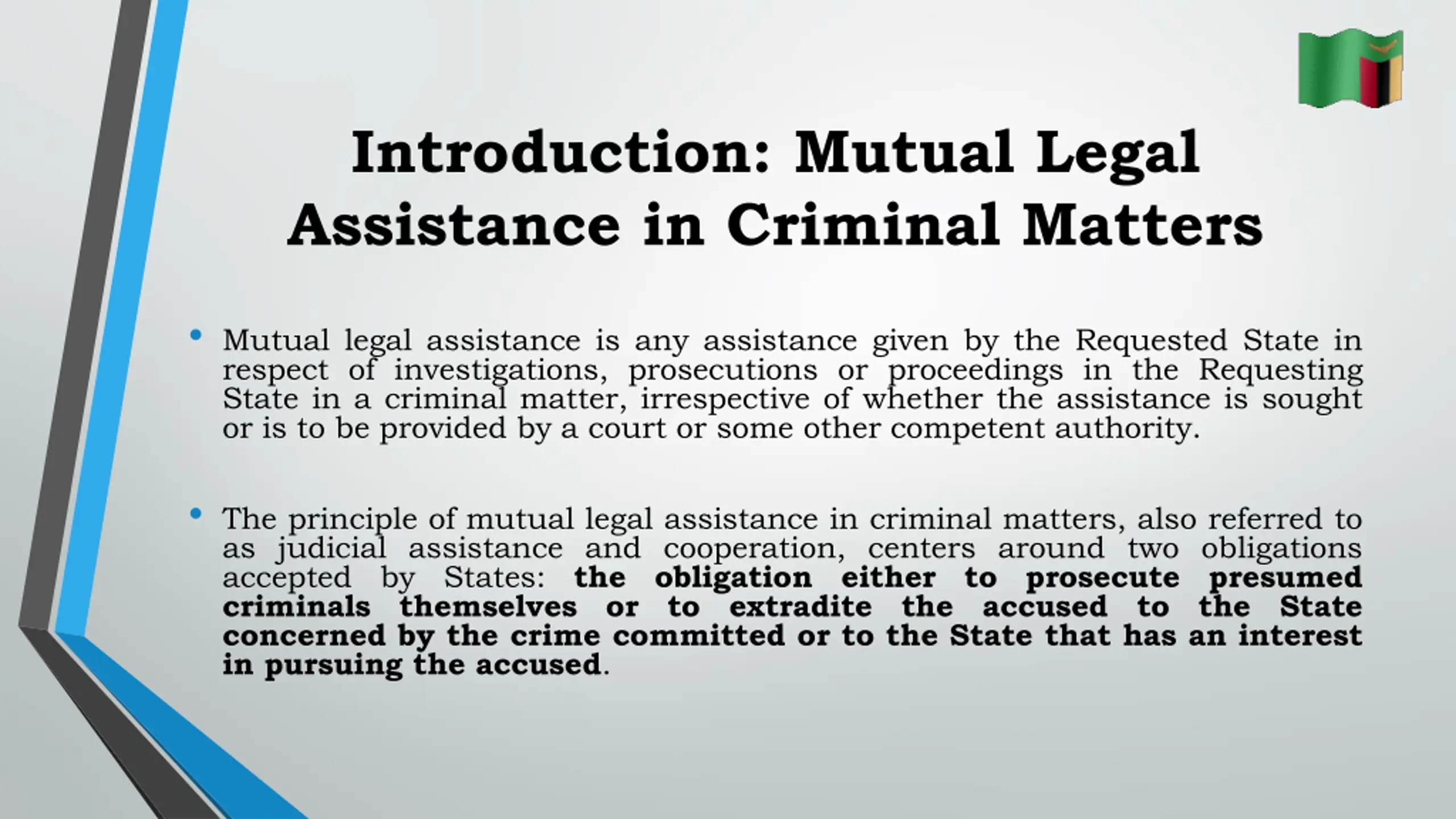 Introduction: Mutual Legal Assistance in Criminal Matters Mutual legal assistance is any assistance given by the Requested State in respect of investigations, prosecutions or proceedings in the Requesting State in a criminal matter, irrespective of whether the assistance is sought or is to be provided by a court or some other competent authority. The principle of mutual legal assistance in criminal matters, also referred to as judicial assistance and cooperation, centers around two obligations accepted by States: the obligation criminals themselves or to extradite concerned by the crime committed or to the State that has an interest in pursuing the accused. either to prosecute accused presumed the State the to