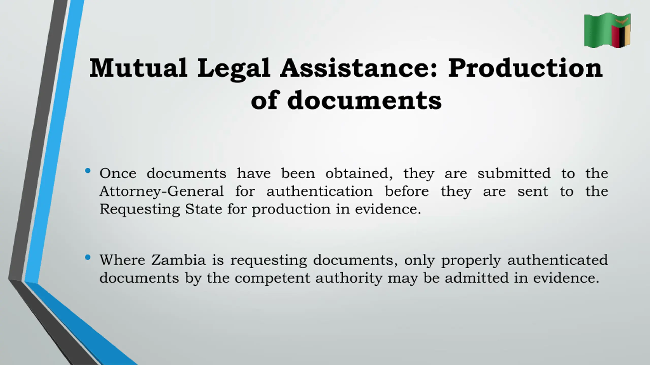 Mutual Legal Assistance: Production of documents Once documents have been obtained, they are submitted to the Attorney-General for authentication before they are sent to the Requesting State for production in evidence. Where Zambia is requesting documents, only properly authenticated documents by the competent authority may be admitted in evidence.