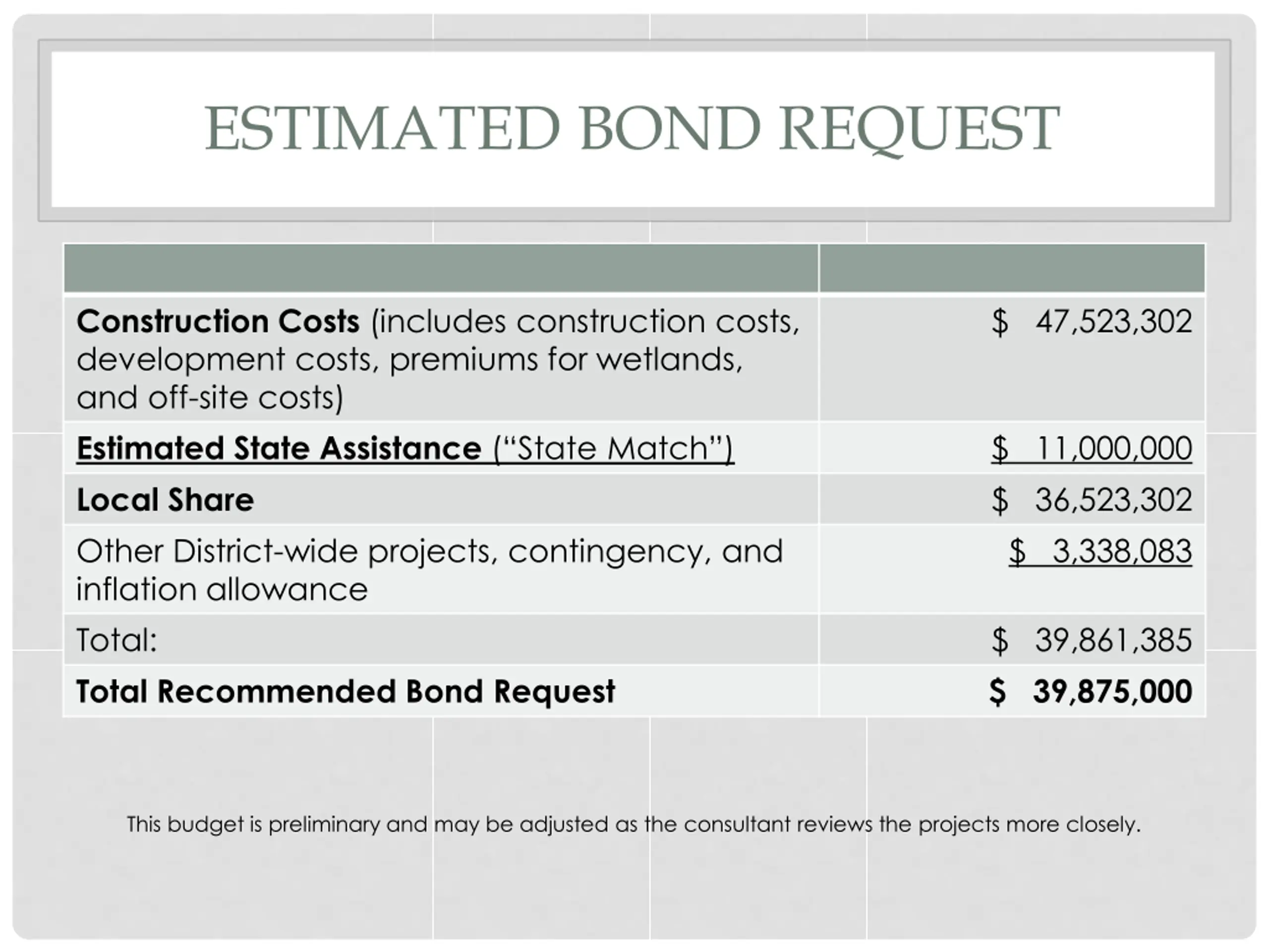ESTIMATED BOND REQUEST Construction Costs (includes construction costs, development costs, premiums for wetlands, and off-site costs) Estimated State Assistance ( State Match ) Local Share Other District-wide projects, contingency, and inflation allowance Total: Total Recommended Bond Request $ 47,523,302 $ 11,000,000 $ 36,523,302 $ 3,338,083 $ 39,861,385 $ 39,875,000 This budget is preliminary and may be adjusted as the consultant reviews the projects more closely.