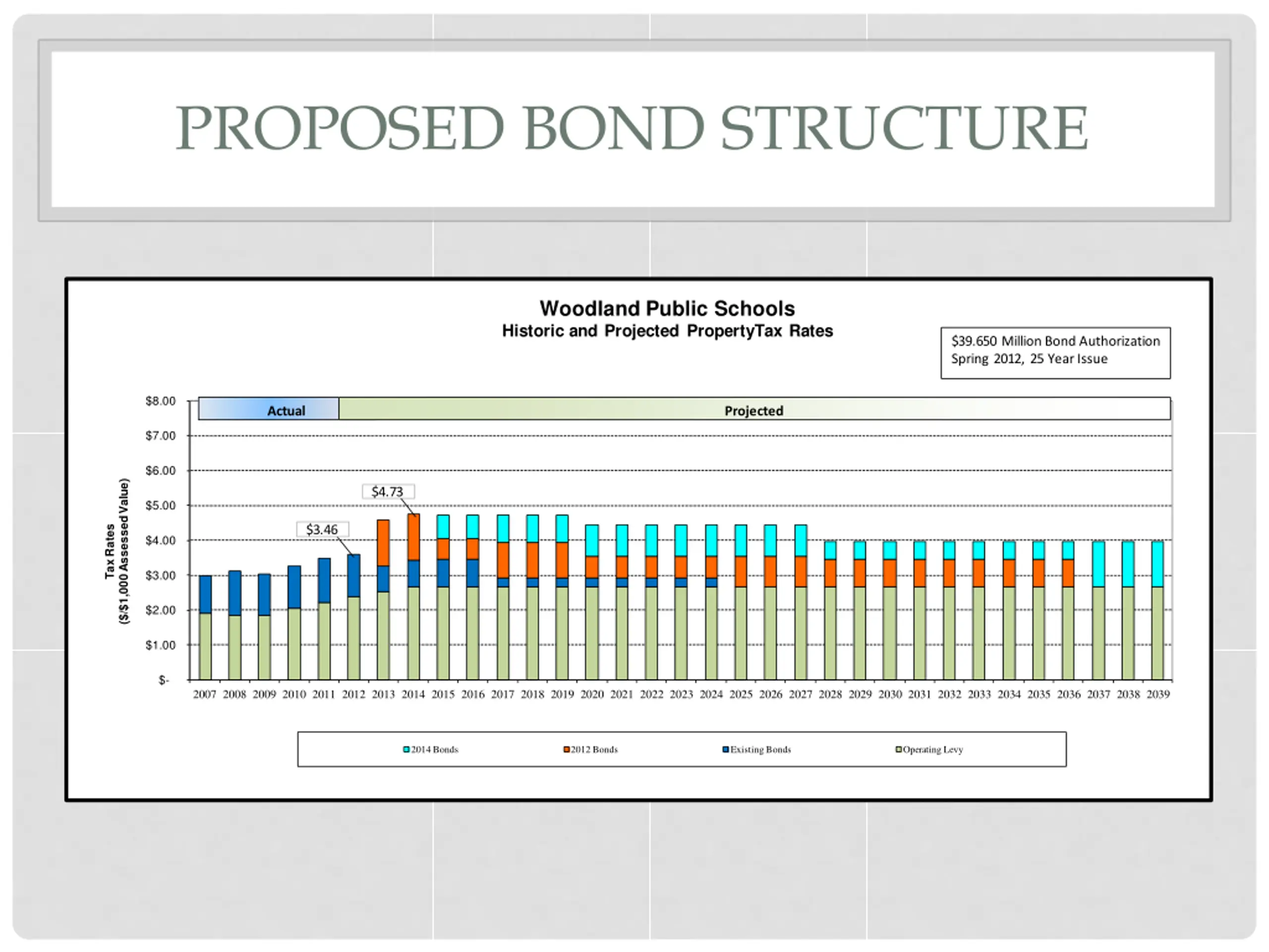 PROPOSED BOND STRUCTURE Woodland Public Schools Historic and Projected PropertyTax Rates $39.650 Million Bond Authorization Spring 2012, 25 Year Issue $8.00 Actual Projected $7.00 $6.00 ($/$1,000 Assessed Value) $4.73 $5.00 Tax Rates $3.46 $4.00 $3.00 $2.00 $1.00 $- 2007 2008 2009 2010 2011 2012 2013 2014 2015 2016 2017 2018 2019 2020 2021 2022 2023 2024 2025 2026 2027 2028 2029 2030 2031 2032 2033 2034 2035 2036 2037 2038 2039 2014 Bonds 2012 Bonds Existing Bonds Operating Levy