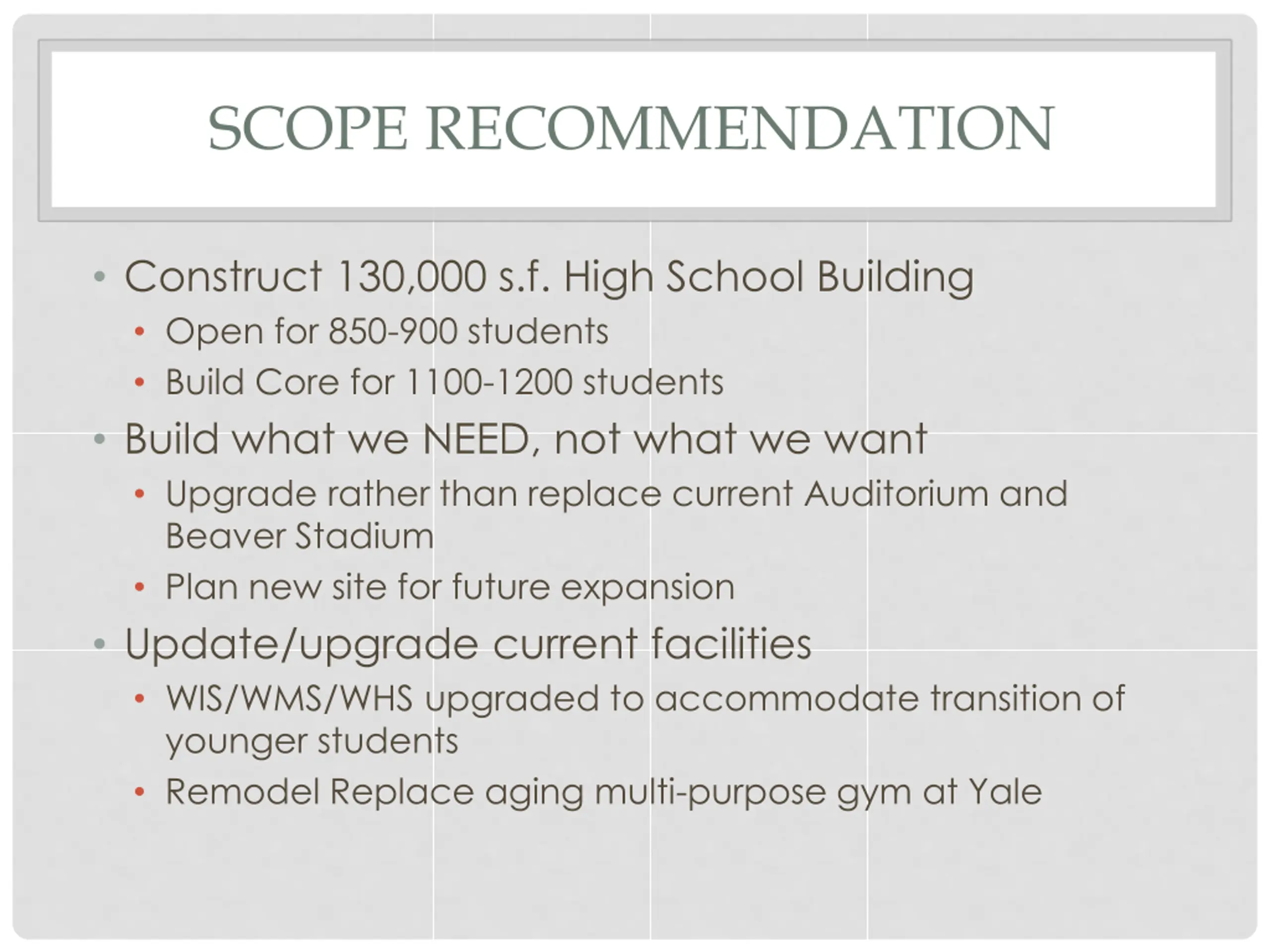SCOPE RECOMMENDATION Construct 130,000 s.f. High School Building Open for 850-900 students Build Core for 1100-1200 students Build what we NEED, not what we want Upgrade rather than replace current Auditorium and Beaver Stadium Plan new site for future expansion Update/upgrade current facilities WIS/WMS/WHS upgraded to accommodate transition of younger students Remodel Replace aging multi-purpose gym at Yale