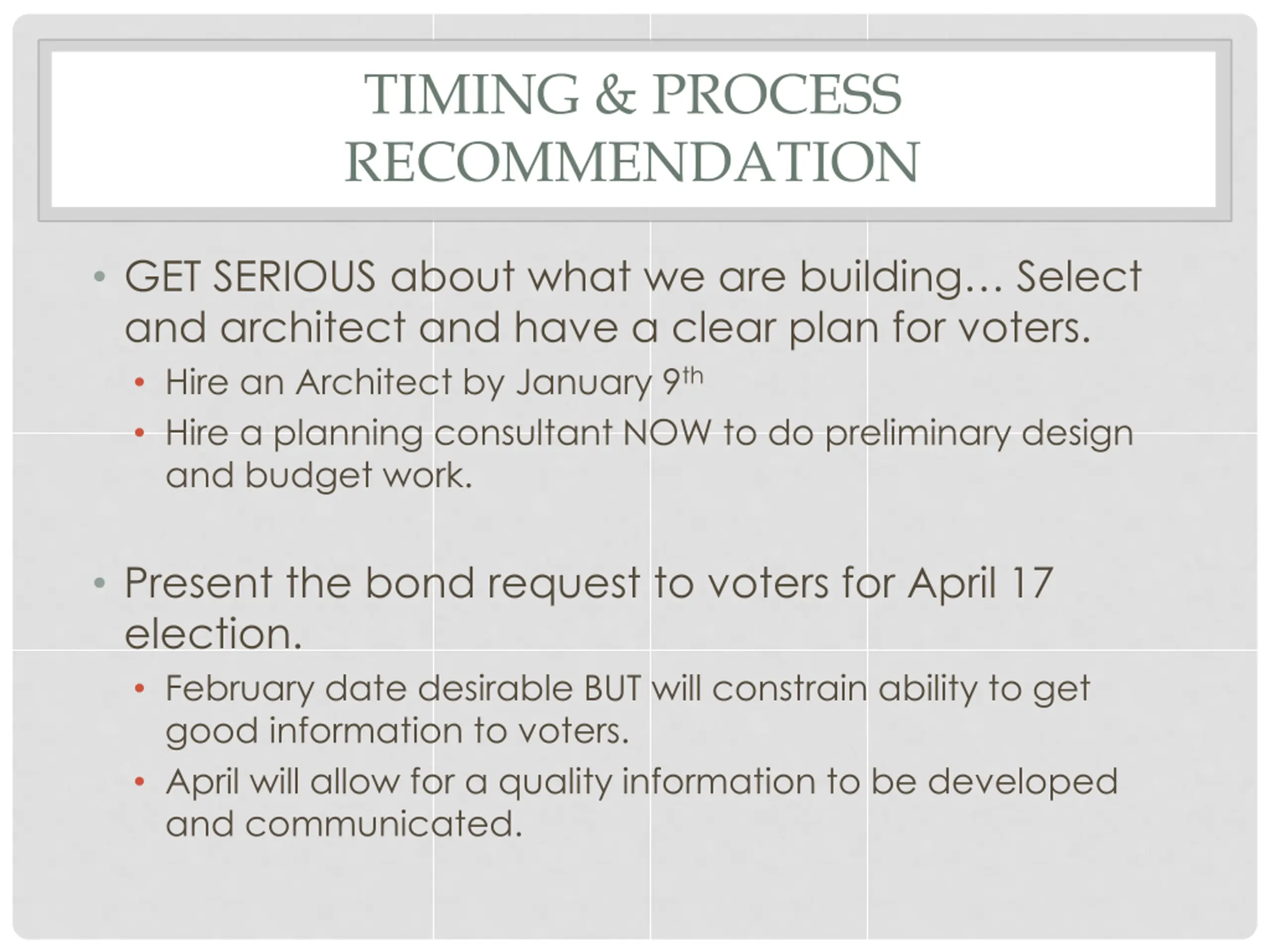 TIMING & PROCESS RECOMMENDATION GET SERIOUS about what we are building Select and architect and have a clear plan for voters. Hire an Architect by January 9th Hire a planning consultant NOW to do preliminary design and budget work. Present the bond request to voters for April 17 election. February date desirable BUT will constrain ability to get good information to voters. April will allow for a quality information to be developed and communicated.