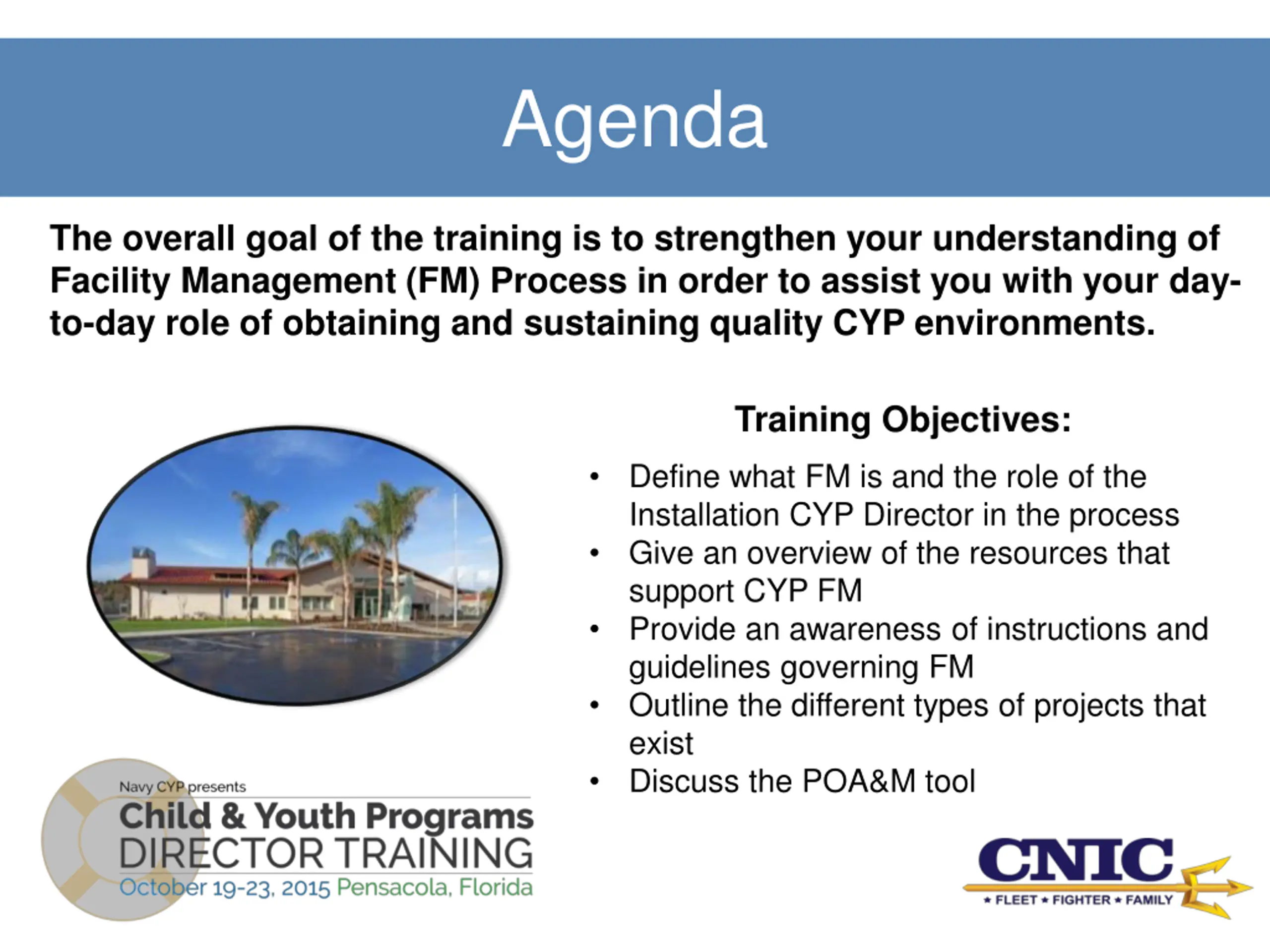 Agenda The overall goal of the training is to strengthen your understanding of Facility Management (FM) Process in order to assist you with your day- to-day role of obtaining and sustaining quality CYP environments. Training Objectives: Define what FM is and the role of the Installation CYP Director in the process Give an overview of the resources that support CYP FM Provide an awareness of instructions and guidelines governing FM Outline the different types of projects that exist Discuss the POA&M tool