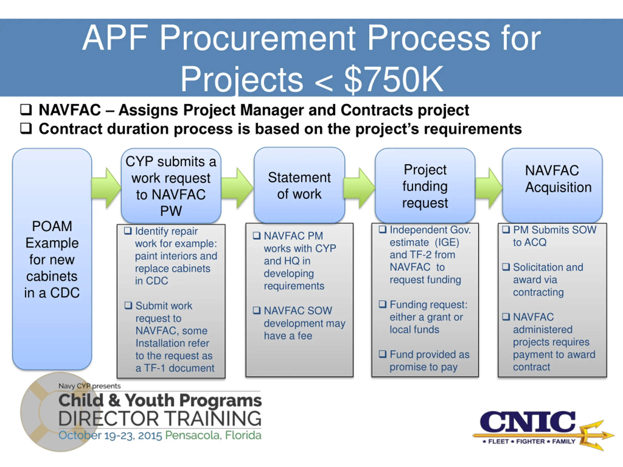 APF Procurement Process for Projects < $750K NAVFAC Assigns Project Manager and Contracts project Contract duration process is based on the project s requirements CYP submits a work request to NAVFAC PW Project funding request NAVFAC Acquisition Statement of work POAM Example for new cabinets in a CDC Independent Gov. estimate (IGE) and TF-2 from NAVFAC to request funding Funding request: either a grant or local funds PM Submits SOW to ACQ Identify repair work for example: paint interiors and replace cabinets in CDC NAVFAC PM works with CYP and HQ in developing requirements Solicitation and award via contracting Submit work request to NAVFAC, some Installation refer to the request as a TF-1 document NAVFAC SOW development may have a fee NAVFAC administered projects requires payment to award contract Fund provided as promise to pay