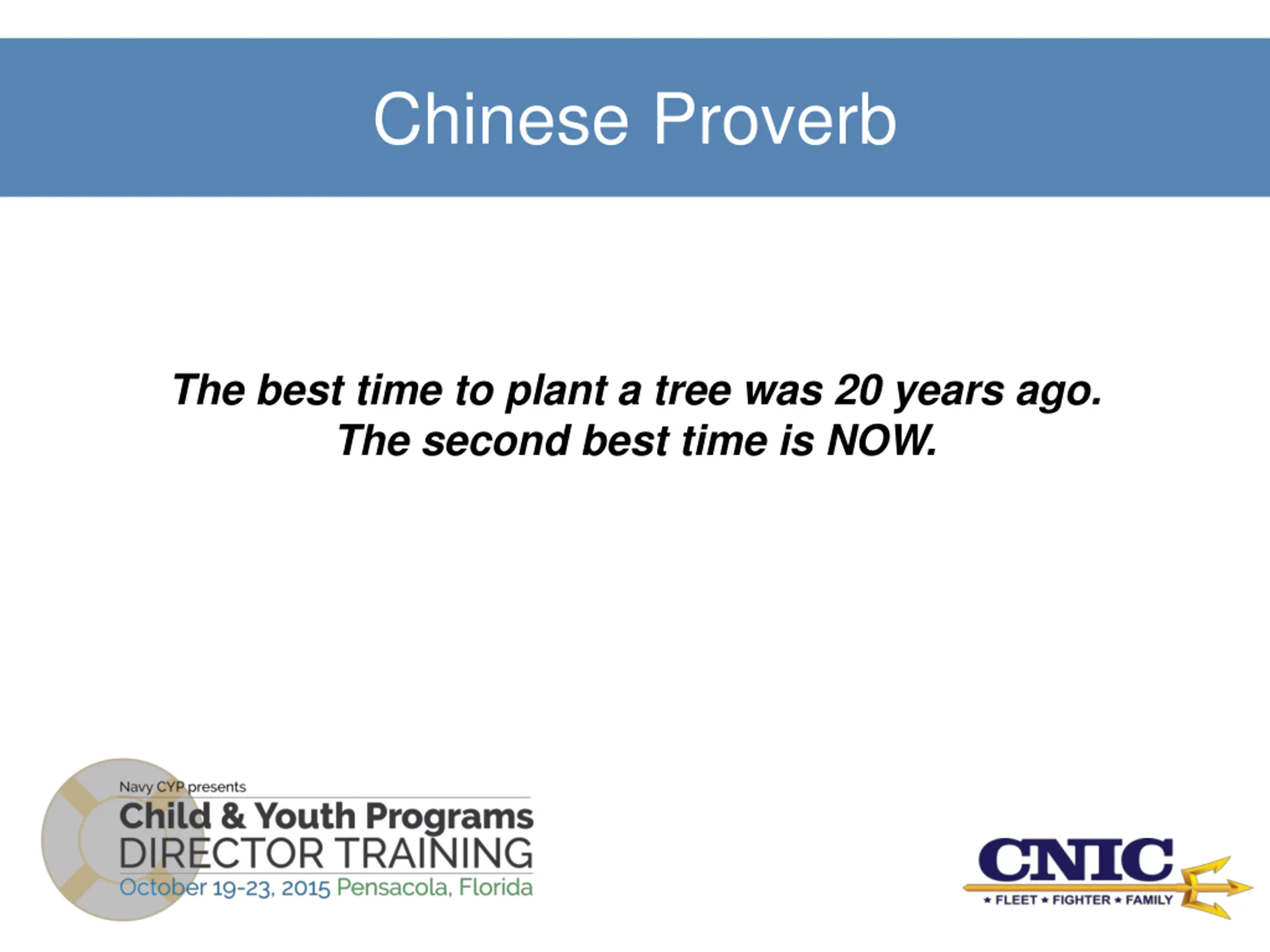 Chinese Proverb The best time to plant a tree was 20 years ago. The second best time is NOW.