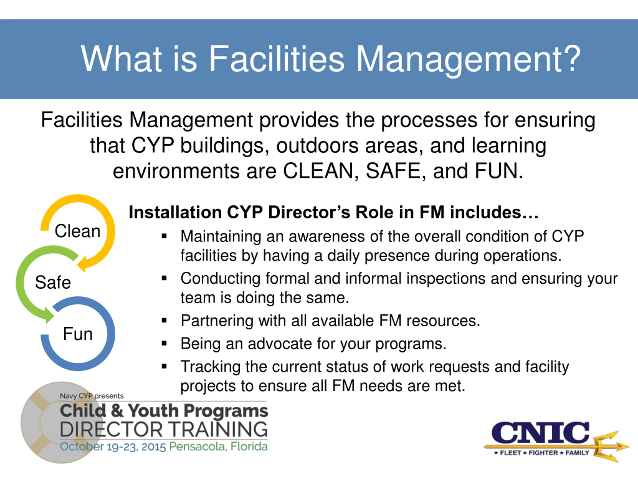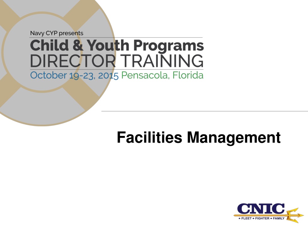 What is Facilities Management? Facilities Management provides the processes for ensuring that CYP buildings, outdoors areas, and learning environments are CLEAN, SAFE, and FUN. Installation CYP Director s Role in FM includes Maintaining an awareness of the overall condition of CYP facilities by having a daily presence during operations. Conducting formal and informal inspections and ensuring your team is doing the same. Partnering with all available FM resources. Being an advocate for your programs. Tracking the current status of work requests and facility projects to ensure all FM needs are met. Clean Safe Fun
