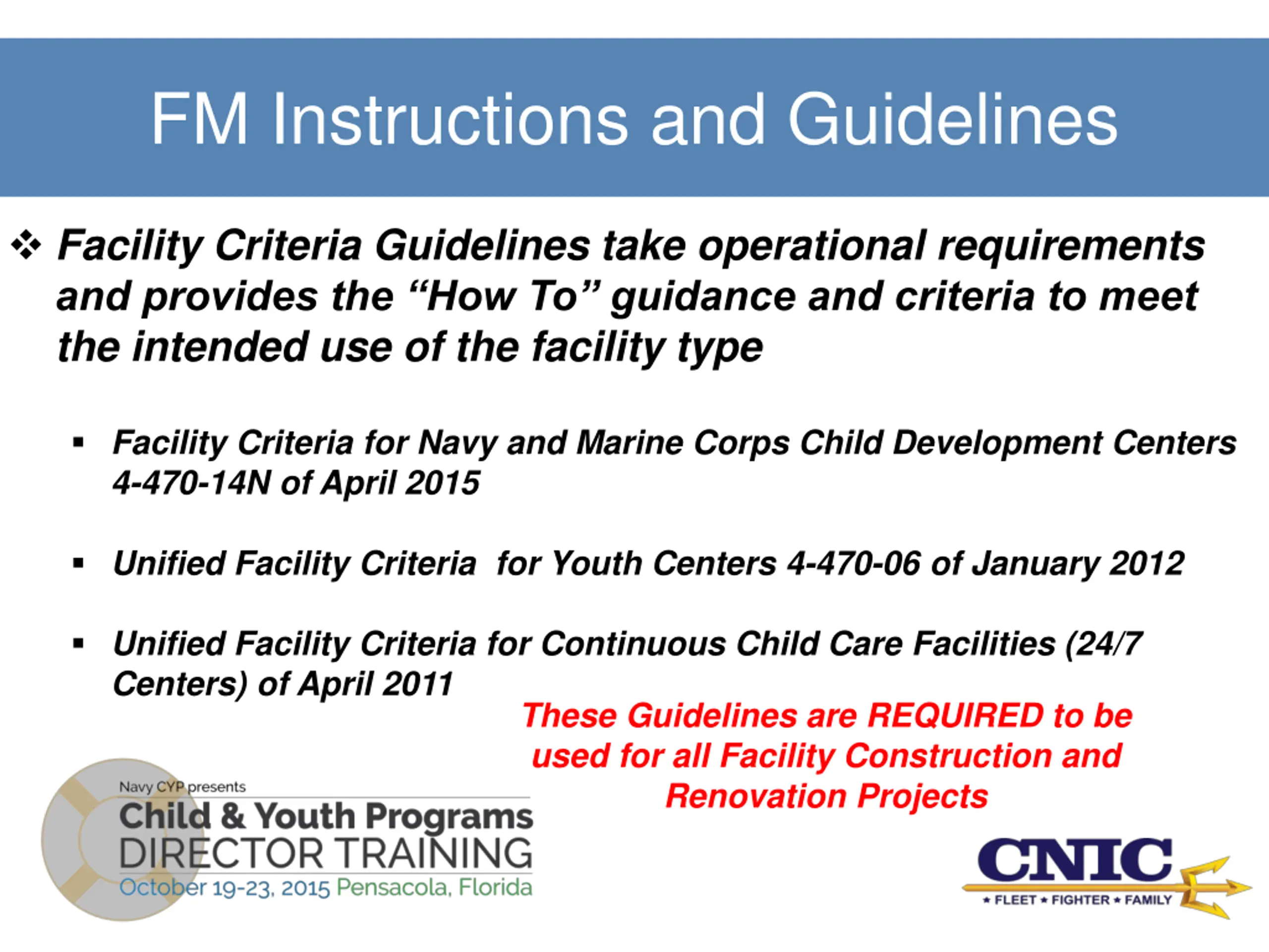 FM Instructions and Guidelines Facility Criteria Guidelines take operational requirements and provides the How To guidance and criteria to meet the intended use of the facility type Facility Criteria for Navy and Marine Corps Child Development Centers 4-470-14N of April 2015 Unified Facility Criteria for Youth Centers 4-470-06 of January 2012 Unified Facility Criteria for Continuous Child Care Facilities (24/7 Centers) of April 2011 These Guidelines are REQUIRED to be used for all Facility Construction and Renovation Projects