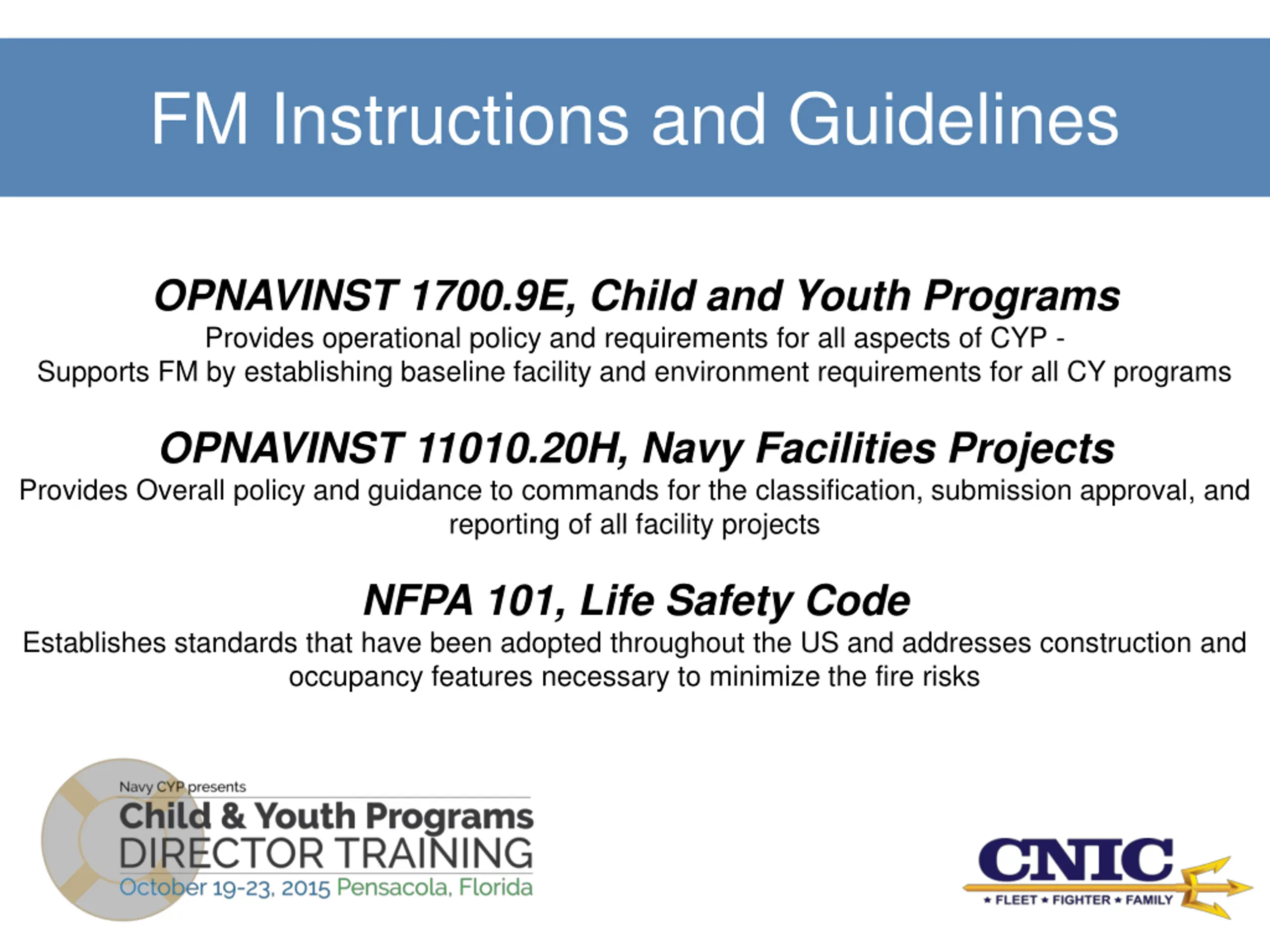 FM Instructions and Guidelines OPNAVINST 1700.9E, Child and Youth Programs Provides operational policy and requirements for all aspects of CYP - Supports FM by establishing baseline facility and environment requirements for all CY programs OPNAVINST 11010.20H, Navy Facilities Projects Provides Overall policy and guidance to commands for the classification, submission approval, and reporting of all facility projects NFPA 101, Life Safety Code Establishes standards that have been adopted throughout the US and addresses construction and occupancy features necessary to minimize the fire risks