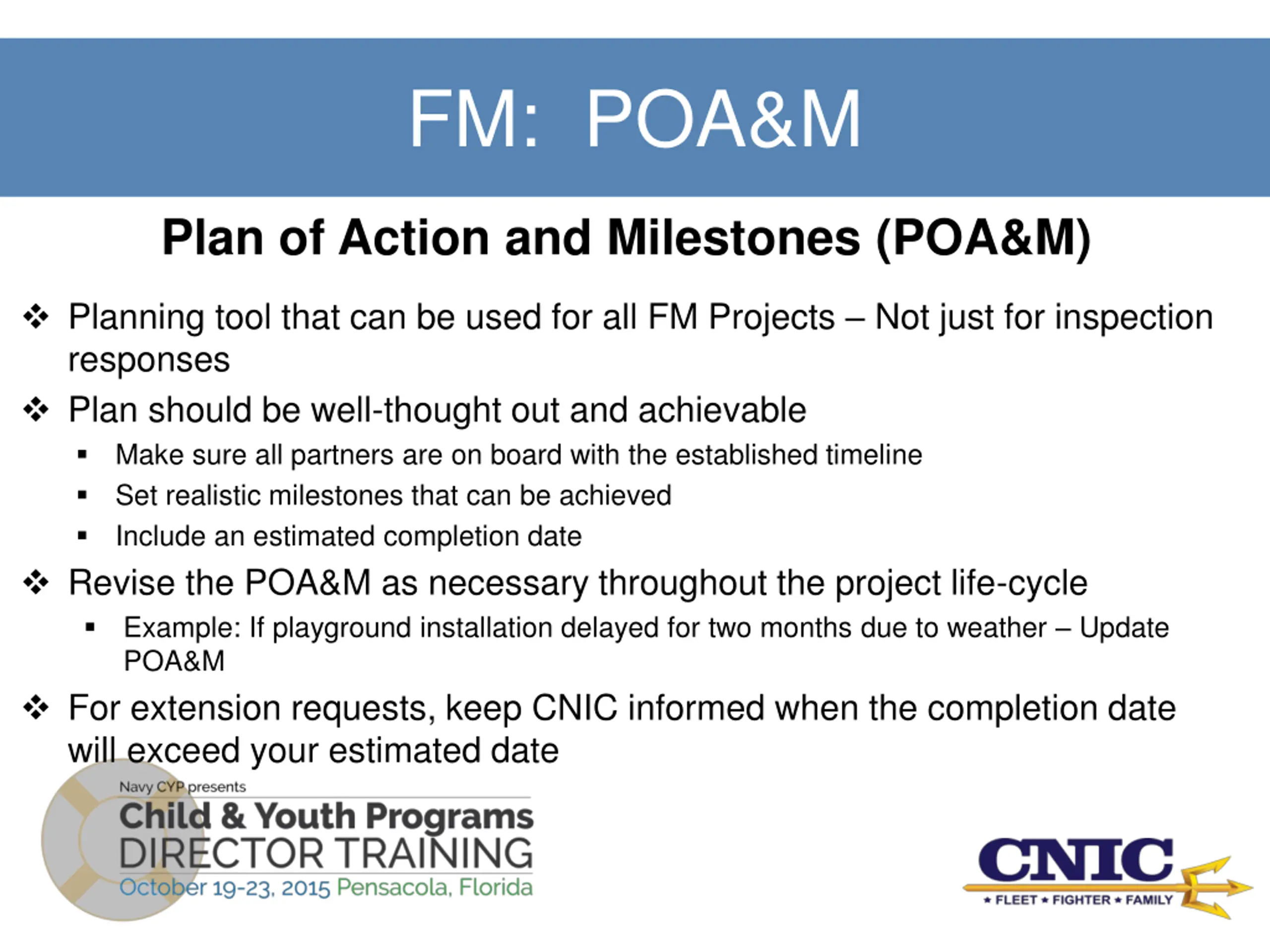 FM: POA&M Plan of Action and Milestones (POA&M) Planning tool that can be used for all FM Projects Not just for inspection responses Plan should be well-thought out and achievable Make sure all partners are on board with the established timeline Set realistic milestones that can be achieved Include an estimated completion date Revise the POA&M as necessary throughout the project life-cycle Example: If playground installation delayed for two months due to weather Update POA&M For extension requests, keep CNIC informed when the completion date will exceed your estimated date