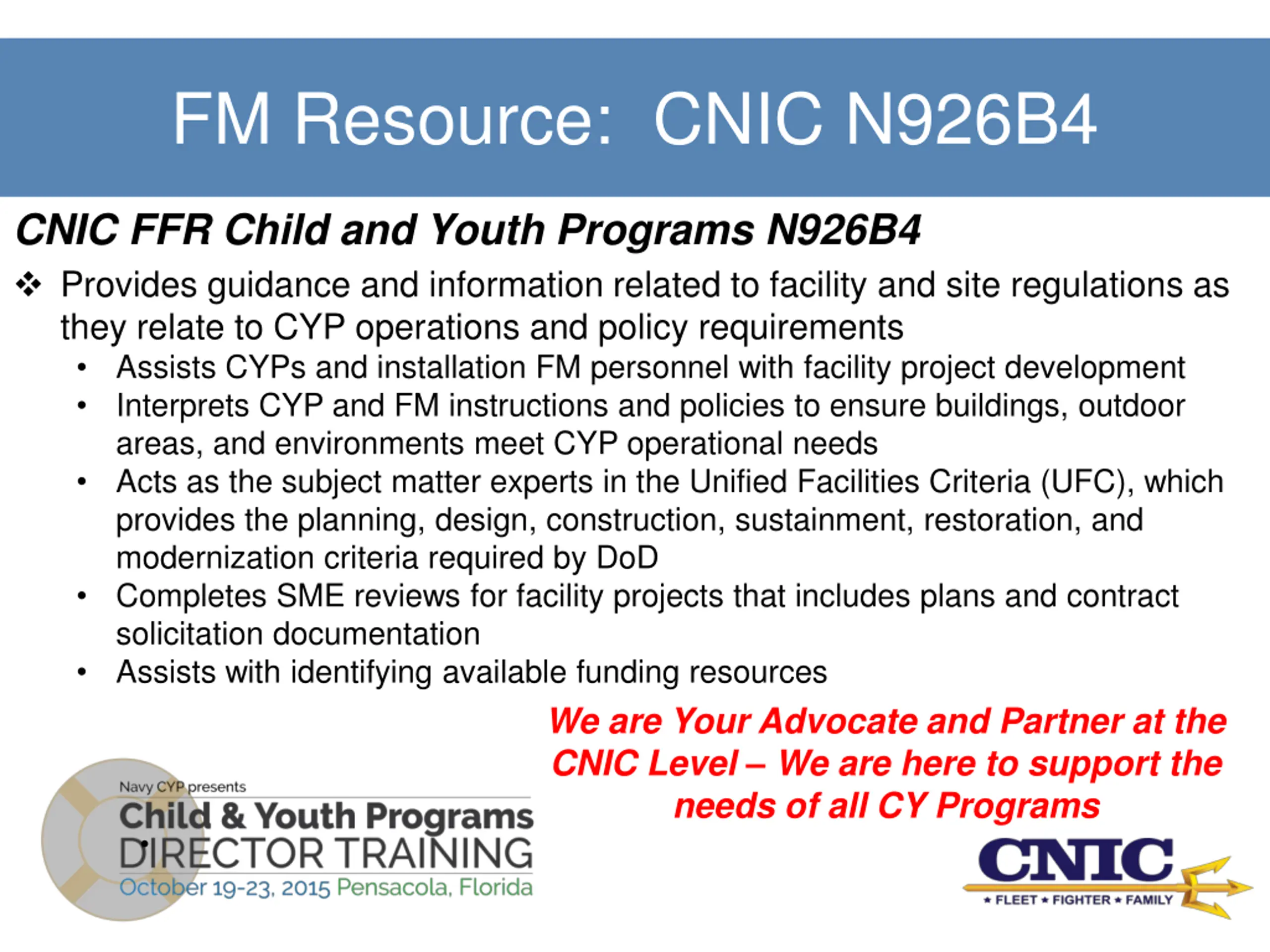 FM Resource: CNIC N926B4 CNIC FFR Child and Youth Programs N926B4 Provides guidance and information related to facility and site regulations as they relate to CYP operations and policy requirements Assists CYPs and installation FM personnel with facility project development Interprets CYP and FM instructions and policies to ensure buildings, outdoor areas, and environments meet CYP operational needs Acts as the subject matter experts in the Unified Facilities Criteria (UFC), which provides the planning, design, construction, sustainment, restoration, and modernization criteria required by DoD Completes SME reviews for facility projects that includes plans and contract solicitation documentation Assists with identifying available funding resources We are Your Advocate and Partner at the CNIC Level We are here to support the needs of all CY Programs