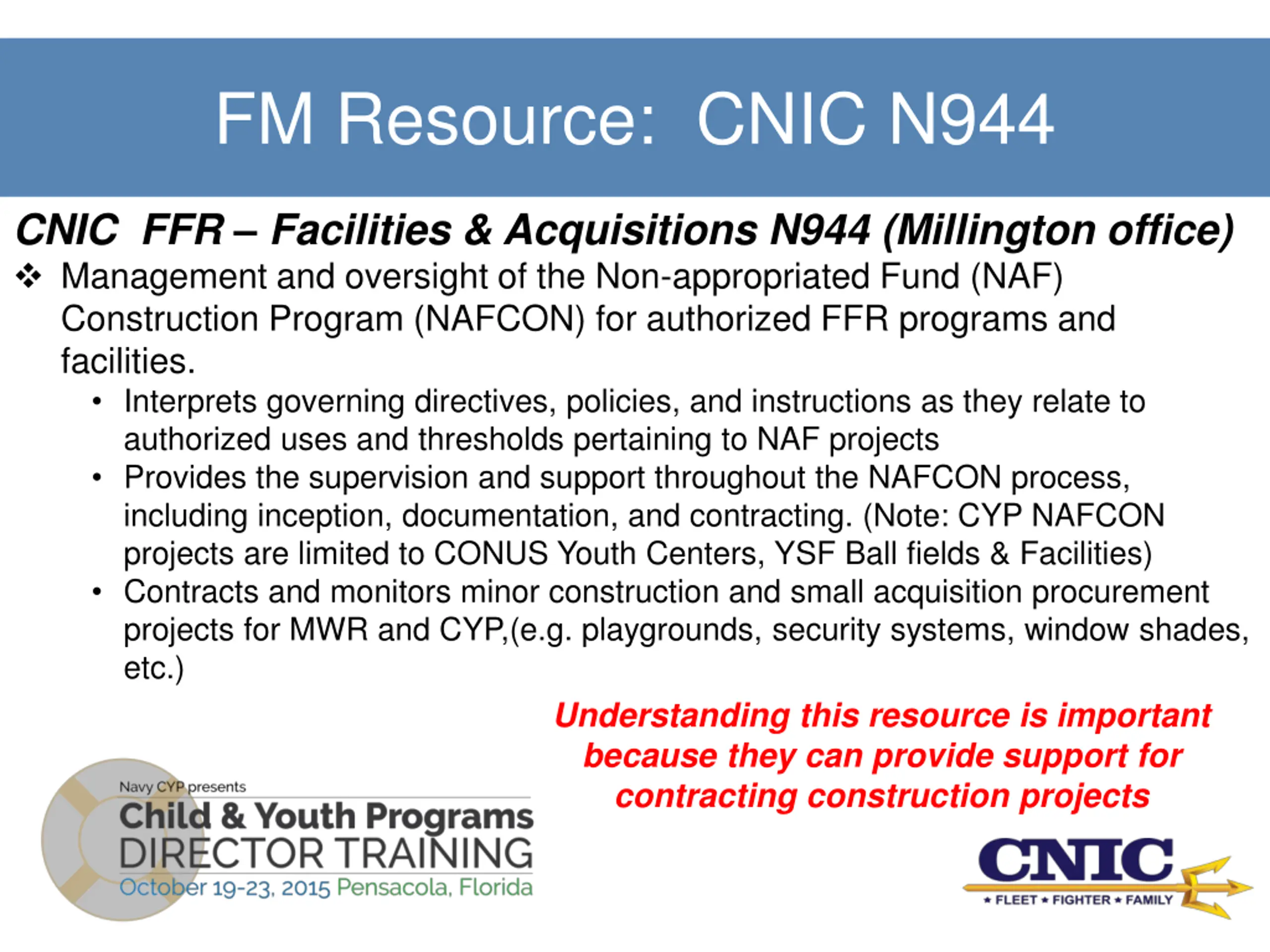 FM Resource: CNIC N944 CNIC FFR Facilities & Acquisitions N944 (Millington office) Management and oversight of the Non-appropriated Fund (NAF) Construction Program (NAFCON) for authorized FFR programs and facilities. Interprets governing directives, policies, and instructions as they relate to authorized uses and thresholds pertaining to NAF projects Provides the supervision and support throughout the NAFCON process, including inception, documentation, and contracting. (Note: CYP NAFCON projects are limited to CONUS Youth Centers, YSF Ball fields & Facilities) Contracts and monitors minor construction and small acquisition procurement projects for MWR and CYP,(e.g. playgrounds, security systems, window shades, etc.) Understanding this resource is important because they can provide support for contracting construction projects