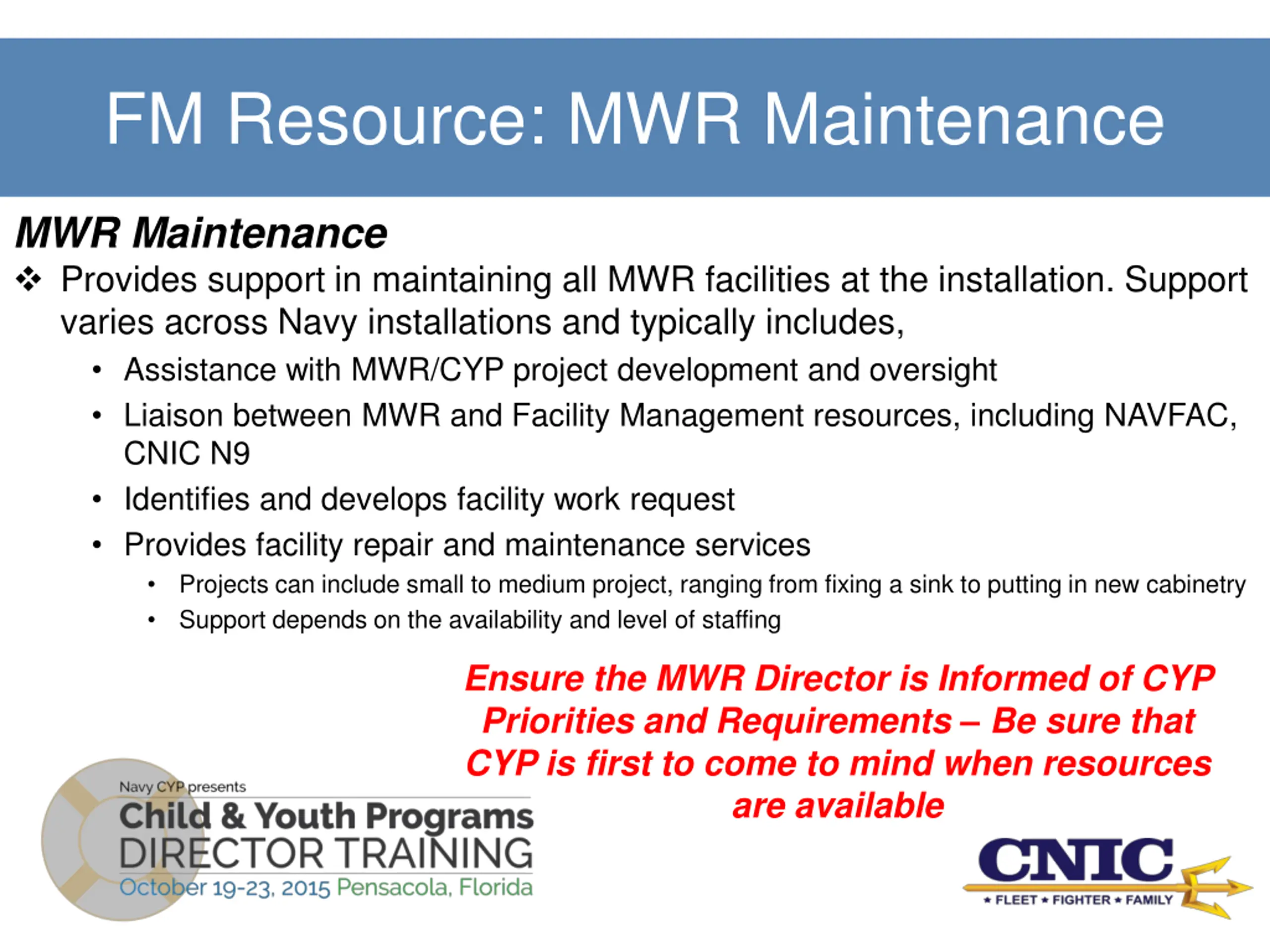 FM Resource: MWR Maintenance MWR Maintenance Provides support in maintaining all MWR facilities at the installation. Support varies across Navy installations and typically includes, Assistance with MWR/CYP project development and oversight Liaison between MWR and Facility Management resources, including NAVFAC, CNIC N9 Identifies and develops facility work request Provides facility repair and maintenance services Projects can include small to medium project, ranging from fixing a sink to putting in new cabinetry Support depends on the availability and level of staffing Ensure the MWR Director is Informed of CYP Priorities and Requirements Be sure that CYP is first to come to mind when resources are available