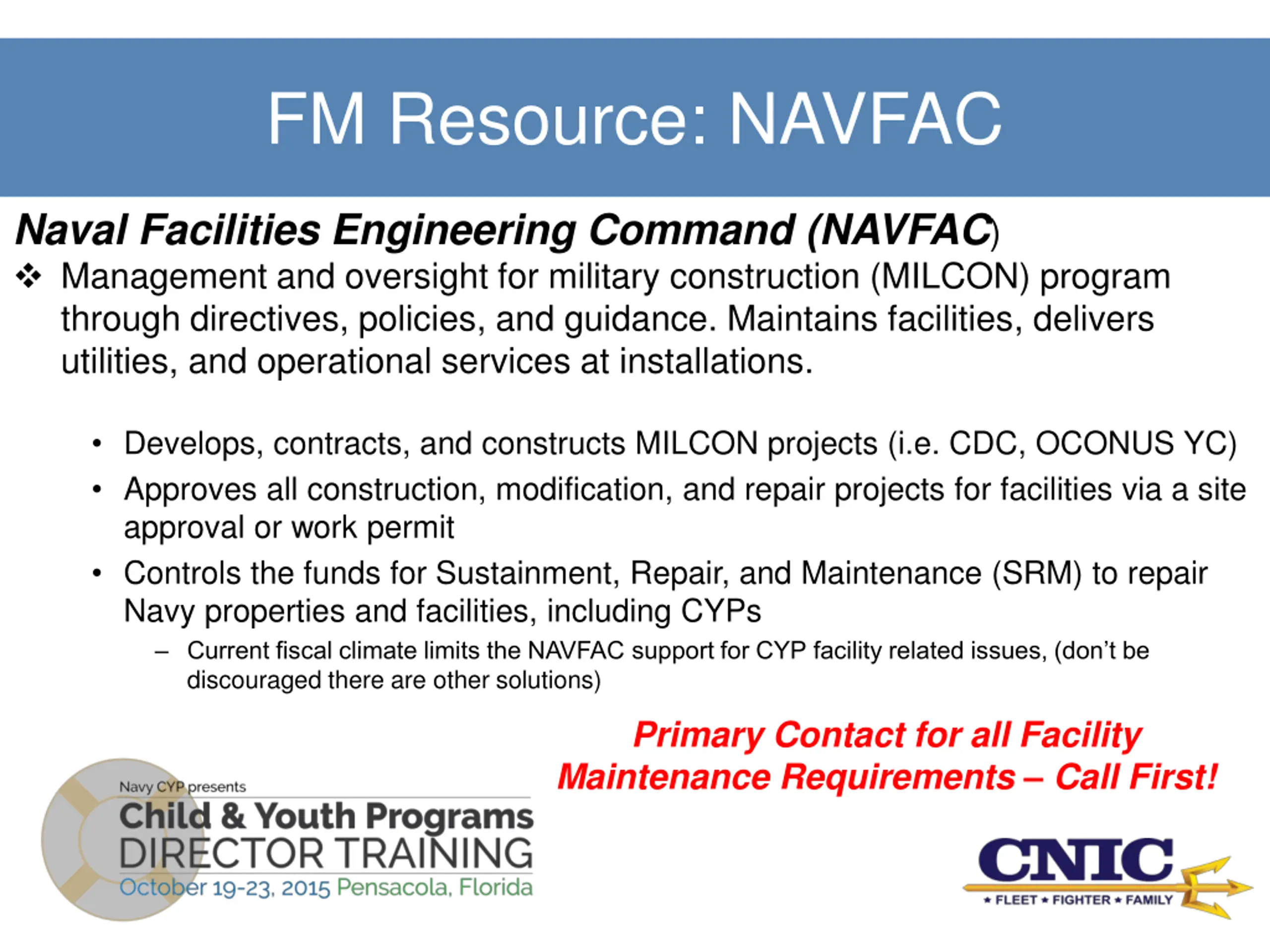 FM Resource: NAVFAC Naval Facilities Engineering Command (NAVFAC) Management and oversight for military construction (MILCON) program through directives, policies, and guidance. Maintains facilities, delivers utilities, and operational services at installations. Develops, contracts, and constructs MILCON projects (i.e. CDC, OCONUS YC) Approves all construction, modification, and repair projects for facilities via a site approval or work permit Controls the funds for Sustainment, Repair, and Maintenance (SRM) to repair Navy properties and facilities, including CYPs Current fiscal climate limits the NAVFAC support for CYP facility related issues, (don t be discouraged there are other solutions) Primary Contact for all Facility Maintenance Requirements Call First!