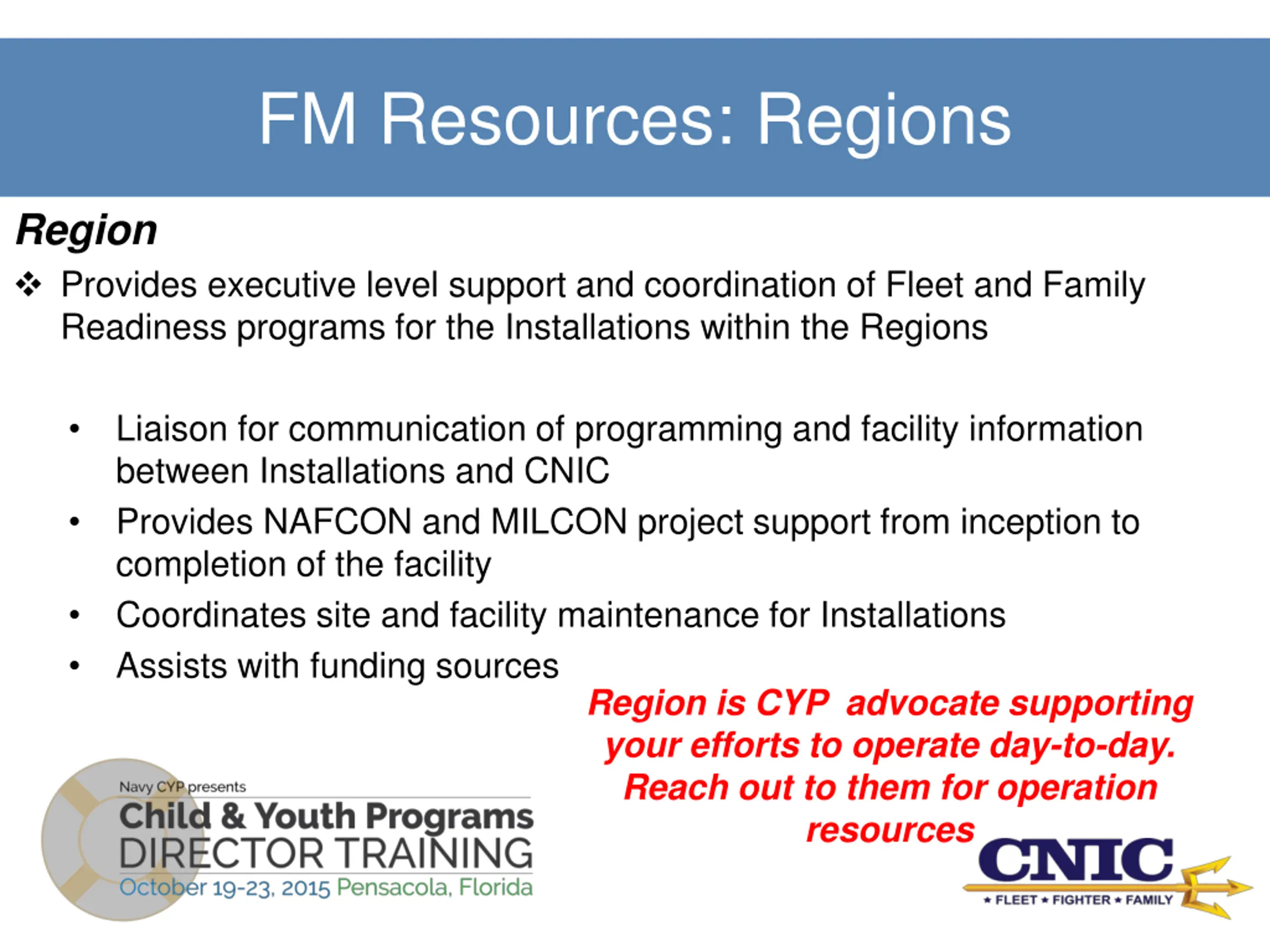 FM Resources: Regions Region Provides executive level support and coordination of Fleet and Family Readiness programs for the Installations within the Regions Liaison for communication of programming and facility information between Installations and CNIC Provides NAFCON and MILCON project support from inception to completion of the facility Coordinates site and facility maintenance for Installations Assists with funding sources Region is CYP advocate supporting your efforts to operate day-to-day. Reach out to them for operation resources