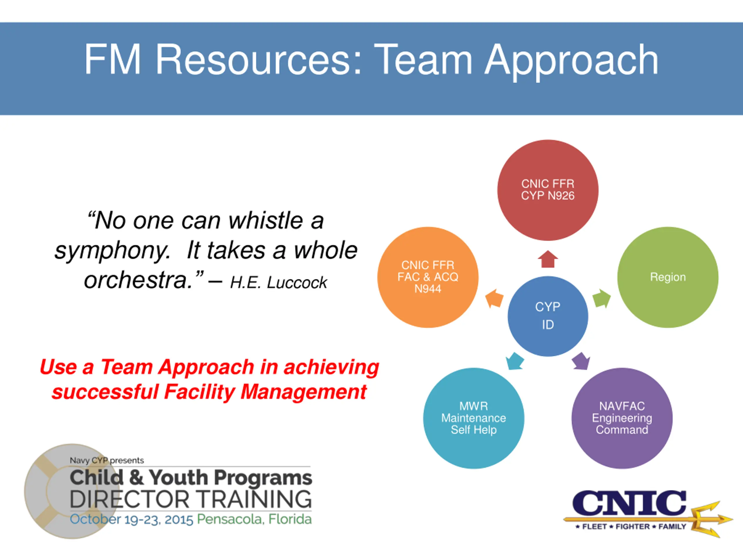 FM Resources: Team Approach CNIC FFR CYP N926 No one can whistle a symphony. It takes a whole orchestra. H.E. Luccock CNIC FFR FAC & ACQ N944 Region CYP ID Use a Team Approach in achieving successful Facility Management MWR NAVFAC Engineering Command Maintenance Self Help