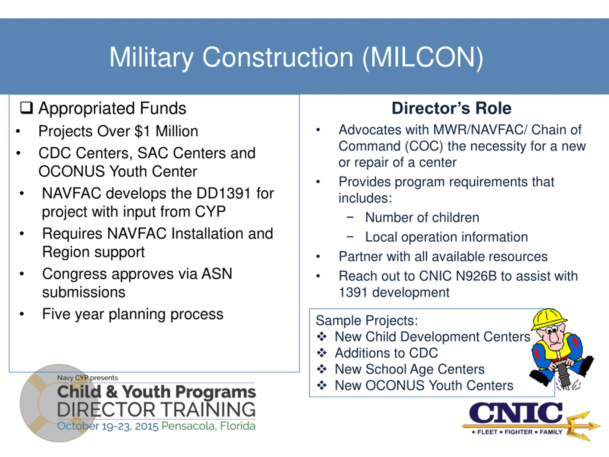 Military Construction (MILCON) Appropriated Funds Projects Over $1 Million CDC Centers, SAC Centers and OCONUS Youth Center NAVFAC develops the DD1391 for project with input from CYP Requires NAVFAC Installation and Region support Congress approves via ASN submissions Five year planning process Director s Role Advocates with MWR/NAVFAC/ Chain of Command (COC) the necessity for a new or repair of a center Provides program requirements that includes: Number of children Local operation information Partner with all available resources Reach out to CNIC N926B to assist with 1391 development Sample Projects: New Child Development Centers Additions to CDC New School Age Centers New OCONUS Youth Centers
