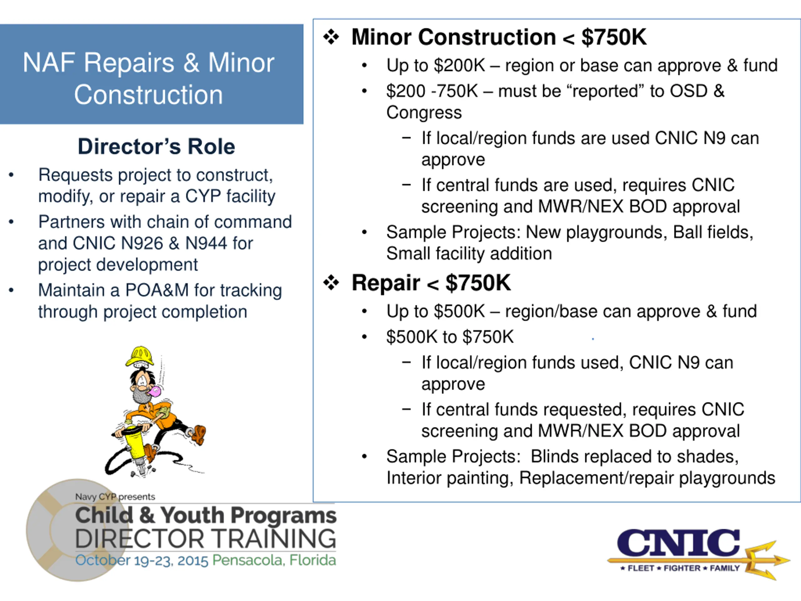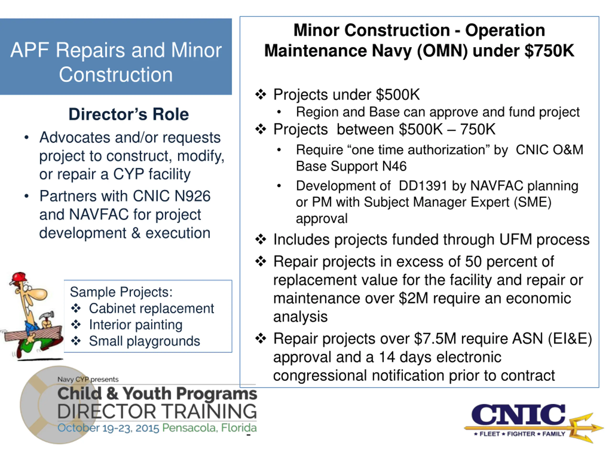 Minor Construction - Operation Maintenance Navy (OMN) under $750K APFRepairs and Minor Construction Projects under $500K Region and Base can approve and fund project Projects between $500K 750K Require one time authorization by CNIC O&M Base Support N46 Development of DD1391 by NAVFAC planning or PM with Subject Manager Expert (SME) approval Includes projects funded through UFM process Repair projects in excess of 50 percent of replacement value for the facility and repair or maintenance over $2M require an economic analysis Repair projects over $7.5M require ASN (EI&E) approval and a 14 days electronic congressional notification prior to contract Director s Role Advocates and/or requests project to construct, modify, or repair a CYP facility Partners with CNIC N926 and NAVFAC for project development & execution . Sample Projects: Cabinet replacement Interior painting Small playgrounds -