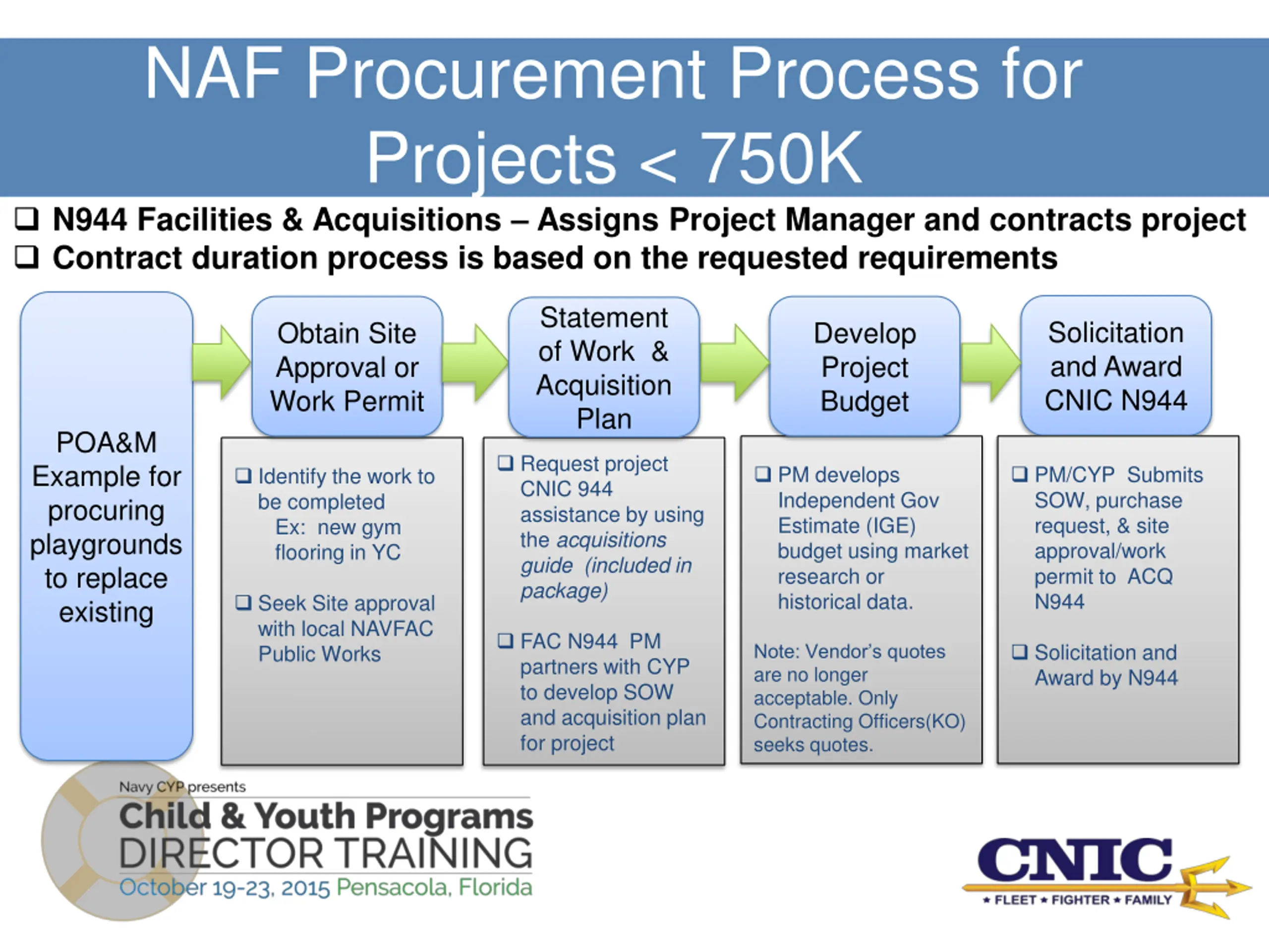 NAF Procurement Process for Projects < 750K N944 Facilities & Acquisitions Assigns Project Manager and contracts project Contract duration process is based on the requested requirements Statement of Work & Acquisition Plan Solicitation and Award CNIC N944 Obtain Site Approval or Work Permit Develop Project Budget POA&M Example for procuring playgrounds to replace existing Request project CNIC 944 assistance by using the acquisitions guide (included in package) PM develops Independent Gov Estimate (IGE) budget using market research or historical data. PM/CYP Submits SOW, purchase request, & site approval/work permit to ACQ N944 Identify the work to be completed Ex: new gym flooring in YC Seek Site approval with local NAVFAC Public Works FAC N944 PM partners with CYP to develop SOW and acquisition plan for project Solicitation and Award by N944 Note: Vendor s quotes are no longer acceptable. Only Contracting Officers(KO) seeks quotes.