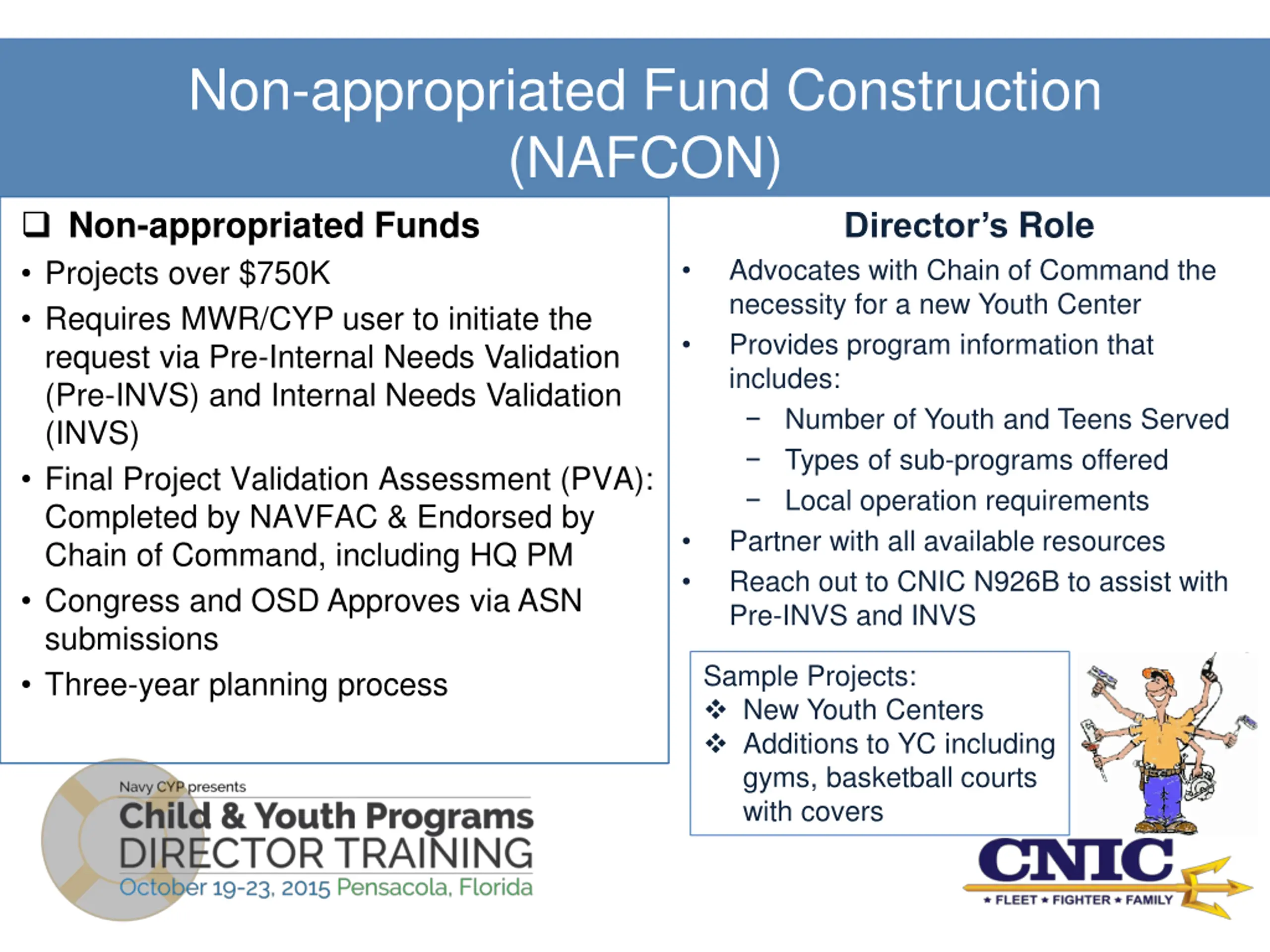 Non-appropriated Fund Construction (NAFCON) Non-appropriated Funds Projects over $750K Requires MWR/CYP user to initiate the request via Pre-Internal Needs Validation (Pre-INVS) and Internal Needs Validation (INVS) Final Project Validation Assessment (PVA): Completed by NAVFAC & Endorsed by Chain of Command, including HQ PM Congress and OSD Approves via ASN submissions Three-year planning process Director s Role Advocates with Chain of Command the necessity for a new Youth Center Provides program information that includes: Number of Youth and Teens Served Types of sub-programs offered Local operation requirements Partner with all available resources Reach out to CNIC N926B to assist with Pre-INVS and INVS Sample Projects: New Youth Centers Additions to YC including gyms, basketball courts with covers