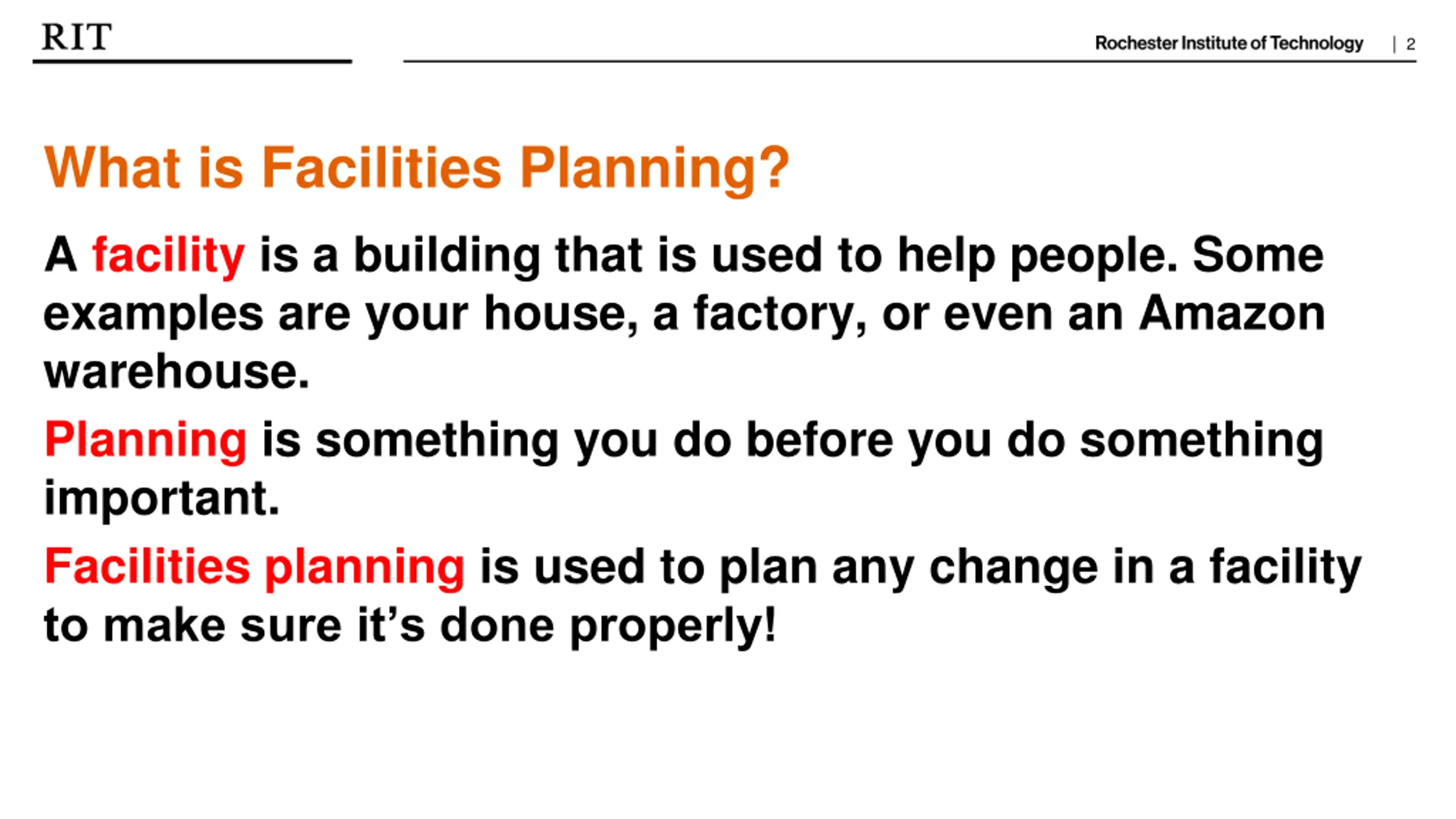 | 2 What is Facilities Planning? A facility is a building that is used to help people. Some examples are your house, a factory, or even an Amazon warehouse. Planning is something you do before you do something important. Facilities planning is used to plan any change in a facility to make sure it s done properly!