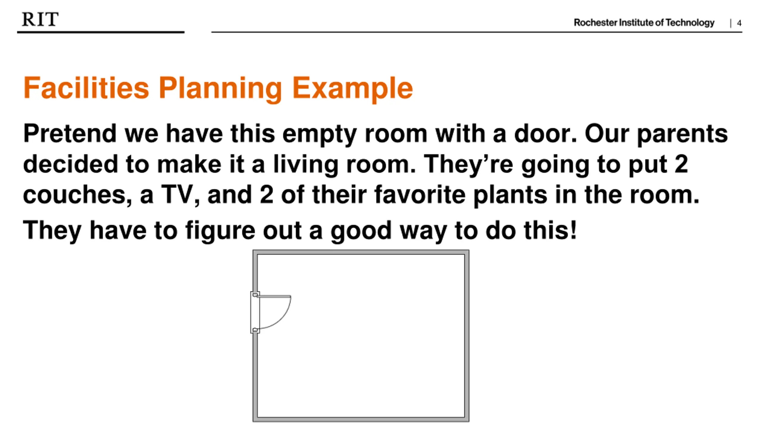 | 4 Facilities Planning Example Pretend we have this empty room with a door. Our parents decided to make it a living room. They re going to put 2 couches, a TV, and 2 of their favorite plants in the room. They have to figure out a good way to do this!