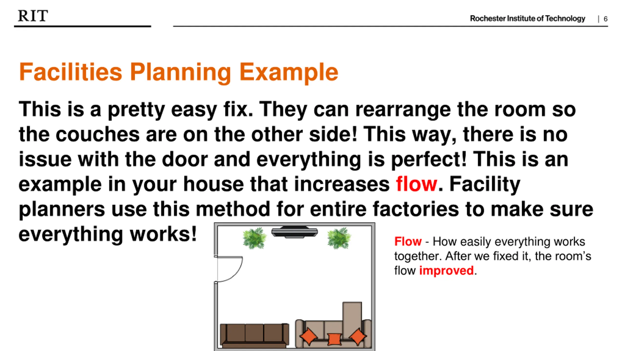 | 6 Facilities Planning Example This is a pretty easy fix. They can rearrange the room so the couches are on the other side! This way, there is no issue with the door and everything is perfect! This is an example in your house that increases flow. Facility planners use this method for entire factories to make sure everything works! Flow - How easily everything works together. After we fixed it, the room s flow improved.