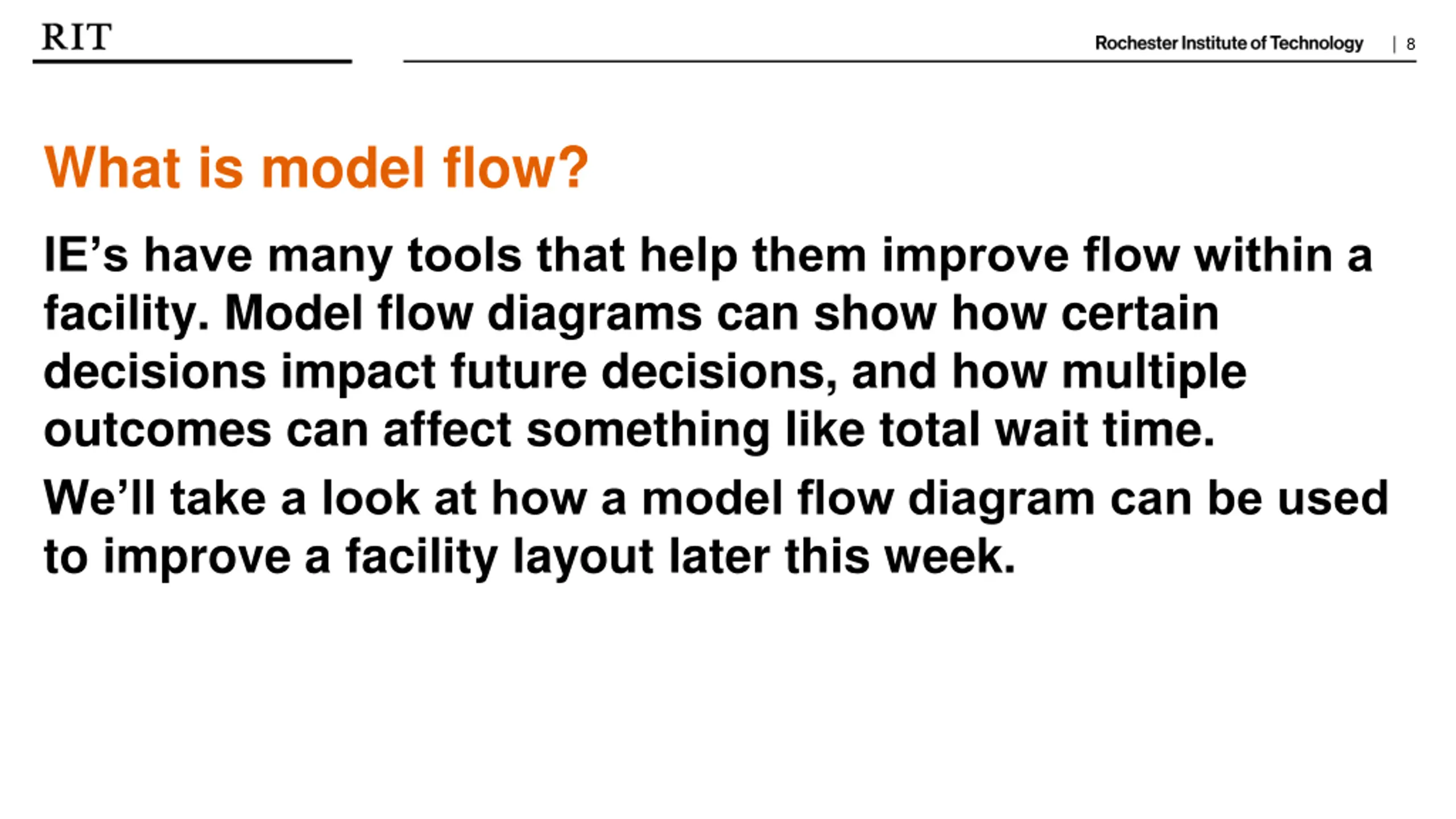 | 8 What is model flow? IE s have many tools that help them improve flow within a facility. Model flow diagrams can show how certain decisions impact future decisions, and how multiple outcomes can affect something like total wait time. We ll take a look at how a model flow diagram can be used to improve a facility layout later this week.