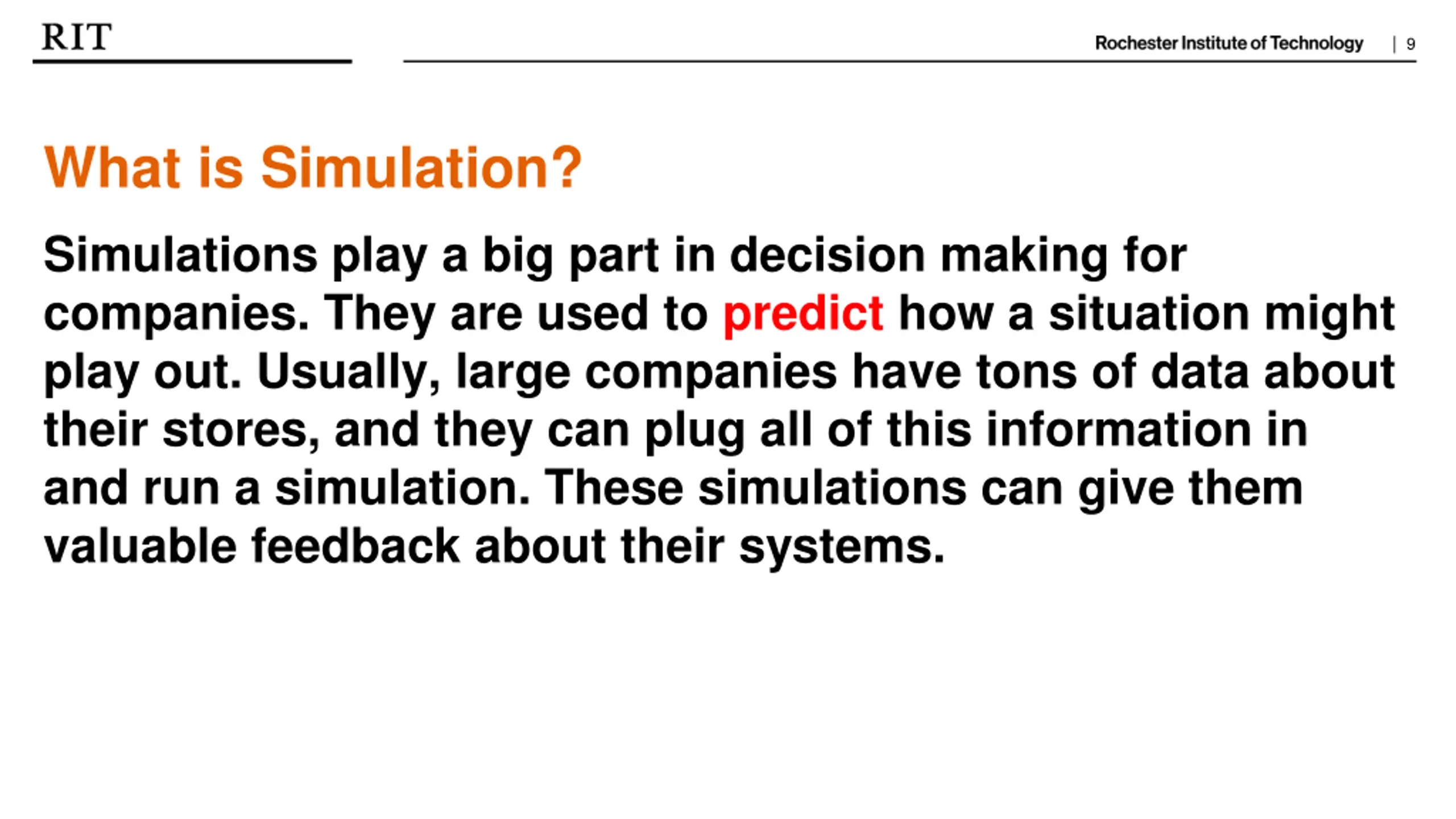 | 9 What is Simulation? Simulations play a big part in decision making for companies. They are used to predict how a situation might play out. Usually, large companies have tons of data about their stores, and they can plug all of this information in and run a simulation. These simulations can give them valuable feedback about their systems.