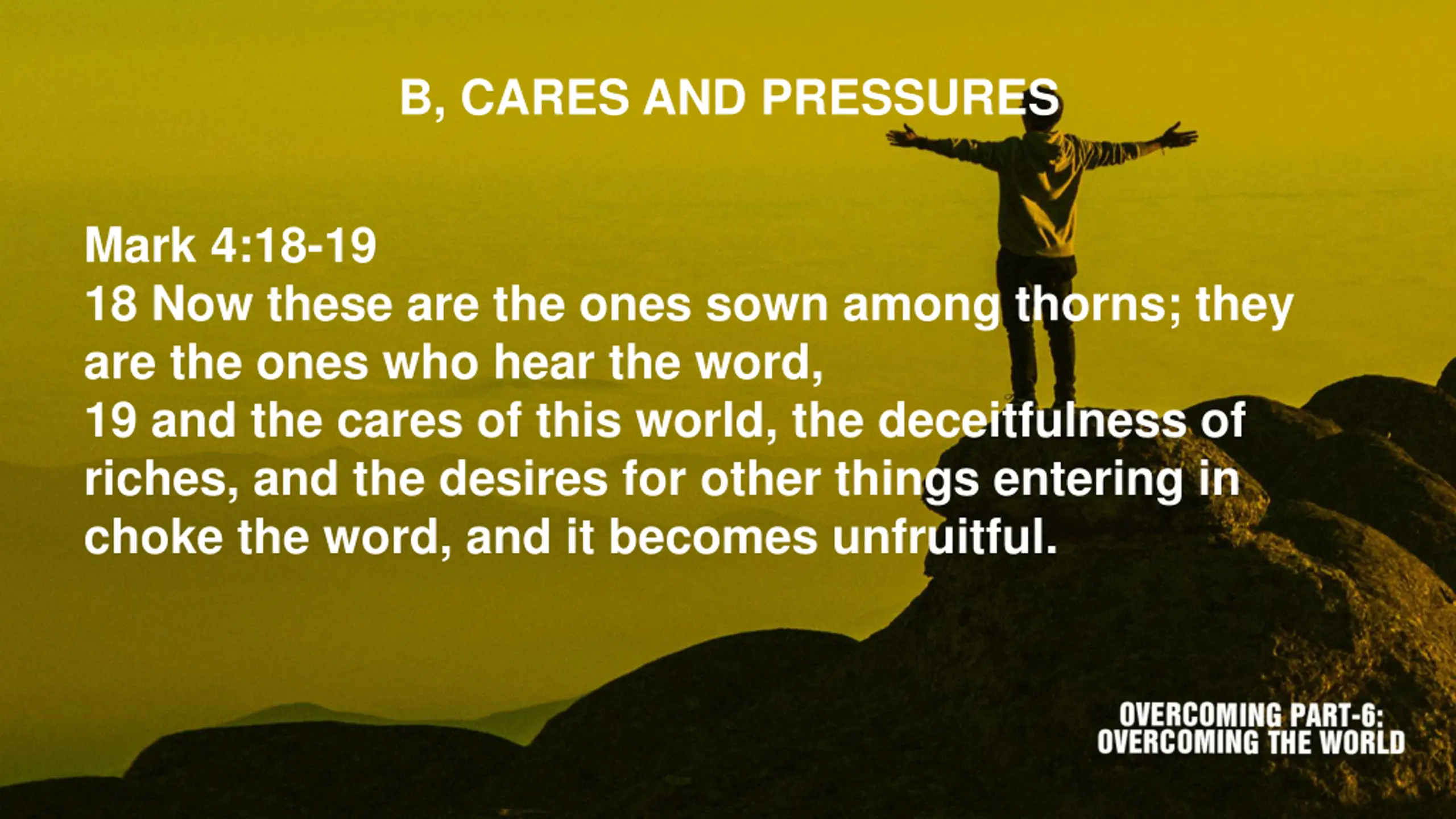 B, CARES AND PRESSURES Mark 4:18-19 18 Now these are the ones sown among thorns; they are the ones who hear the word, 19 and the cares of this world, the deceitfulness of riches, and the desires for other things entering in choke the word, and it becomes unfruitful.