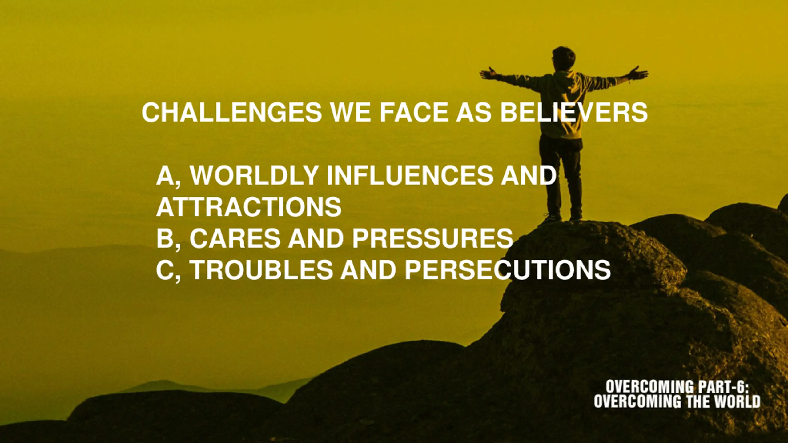 CHALLENGES WE FACE AS BELIEVERS IN THE WORLD A, WORLDLY INFLUENCES AND ATTRACTIONS B, CARES AND PRESSURES C, TROUBLES AND PERSECUTIONS