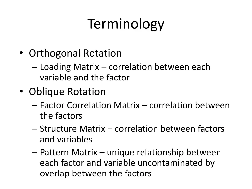 Terminology Orthogonal Rotation Loading Matrix correlation between each variable and the factor Oblique Rotation Factor Correlation Matrix correlation between the factors Structure Matrix correlation between factors and variables Pattern Matrix unique relationship between each factor and variable uncontaminated by overlap between the factors