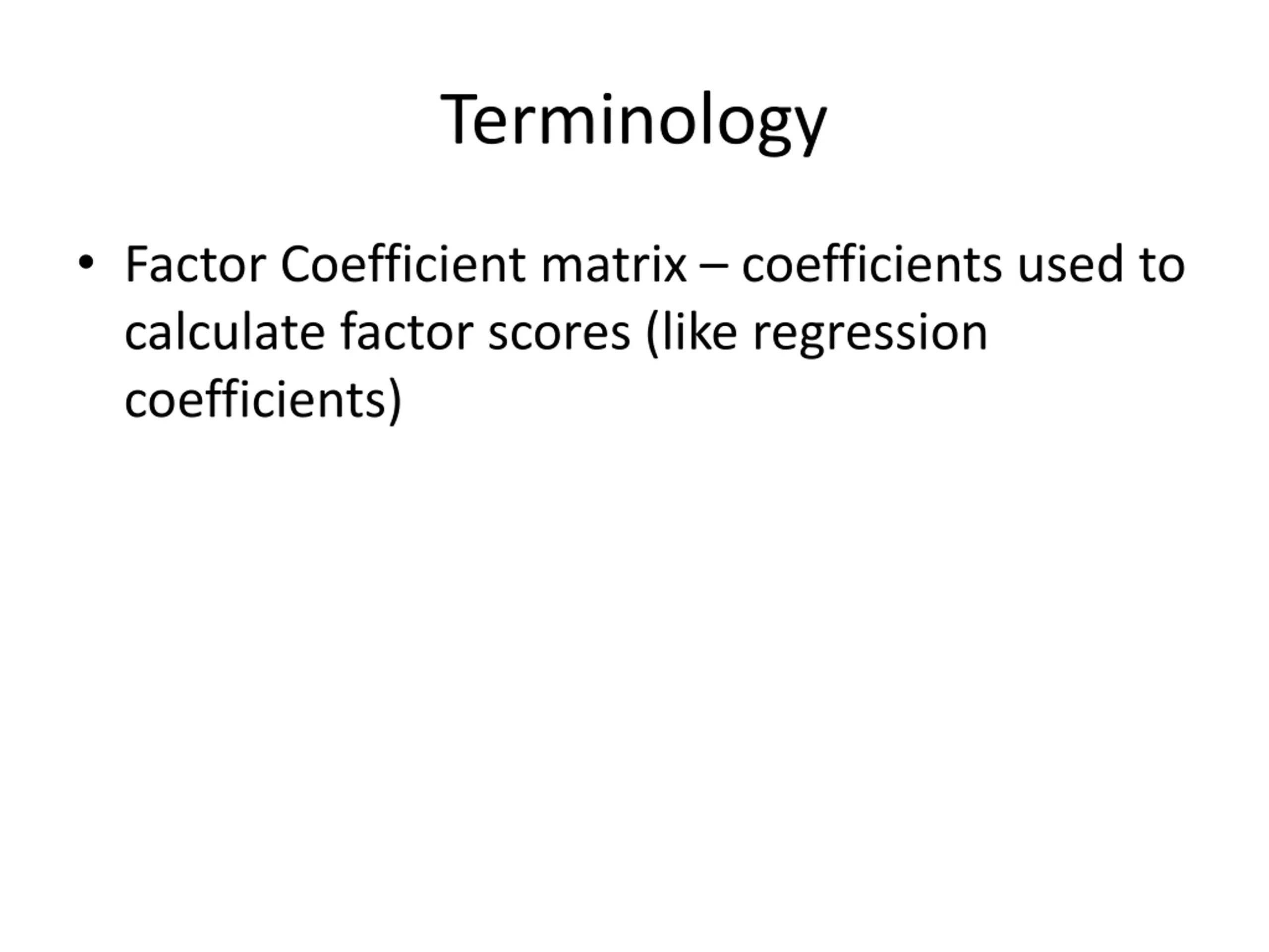 Terminology Factor Coefficient matrix coefficients used to calculate factor scores (like regression coefficients)