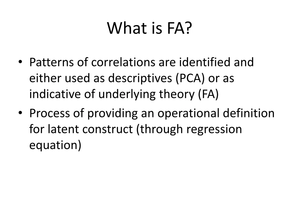 What is FA? Patterns of correlations are identified and either used as descriptives (PCA) or as indicative of underlying theory (FA) Process of providing an operational definition for latent construct (through regression equation)
