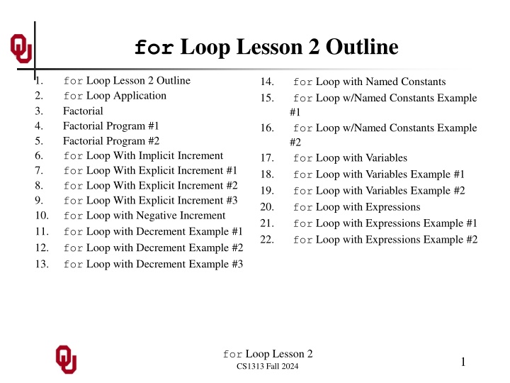 for Loop Lesson 2 Outline 1. 2. 3. 4. 5. 6. 7. 8. 9. 10. 11. 12. 13. for Loop Lesson 2 Outline for Loop Application Factorial Factorial Program #1 Factorial Program #2 for Loop With Implicit Increment for Loop With Explicit Increment #1 for Loop With Explicit Increment #2 for Loop With Explicit Increment #3 for Loop with Negative Increment for Loop with Decrement Example #1 for Loop with Decrement Example #2 for Loop with Decrement Example #3 14. 15. for Loop with Named Constants for Loop w/Named Constants Example #1 for Loop w/Named Constants Example #2 for Loop with Variables for Loop with Variables Example #1 for Loop with Variables Example #2 for Loop with Expressions for Loop with Expressions Example #1 for Loop with Expressions Example #2 16. 17. 18. 19. 20. 21. 22. for Loop Lesson 2 CS1313 Fall 2024 1